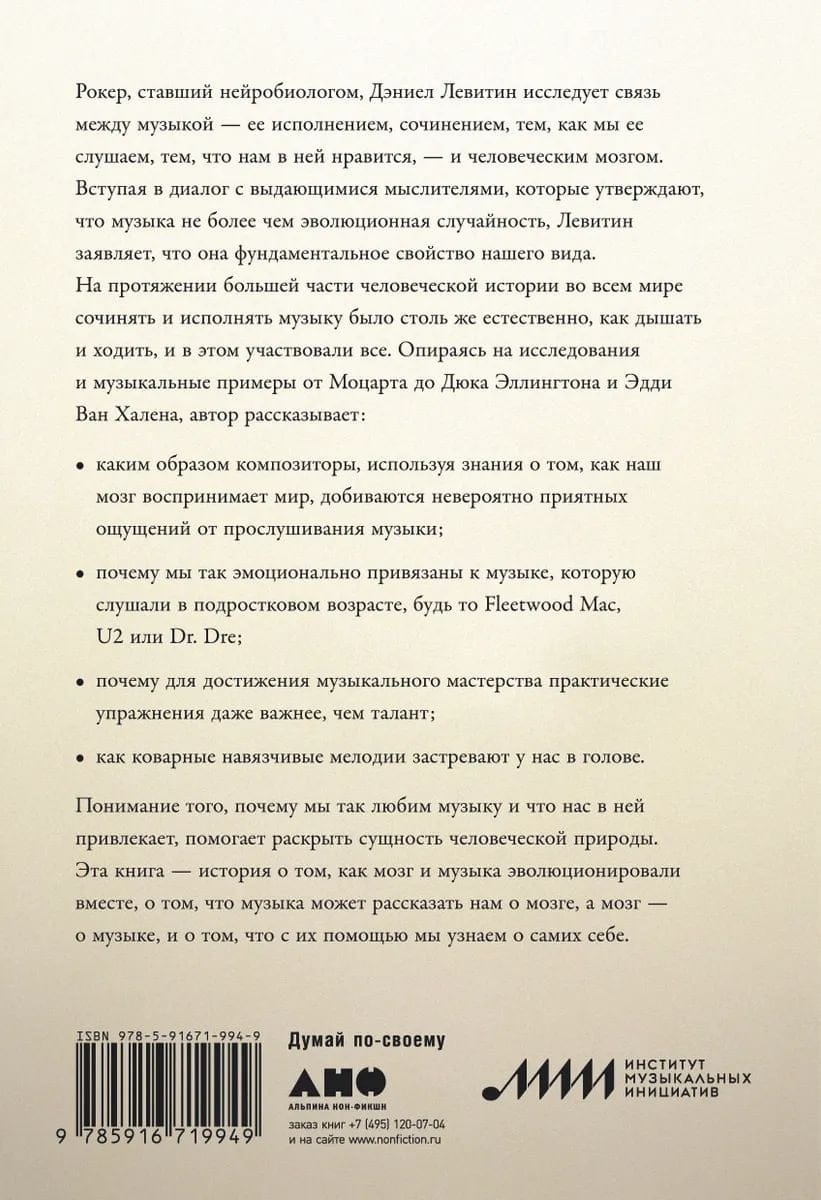 Рокер, ставший нейробиологом, Дэниел Левитин исследует связь между музыкой — ее исполнением, сочинением, тем, как мы ее слушаем, тем, что нам в ней нравится, — и человеческим мозгом. Вступая в диалог с выдающимися мыслителями, которые утверждают, что музыка не более чем эволюционная случайность, Левитин заявляет, что она фундаментальное свойство нашего вида. На протяжении большей части человеческой истории во всем мире сочинять и исполнять музыку было столь же естественно, как дышать и ходить, и в этом участвовали все. Опираясь на исследования и музыкальные примеры от Моцарта до Дюка Эллингтона и Эдди Ван Халена, автор рассказывает: