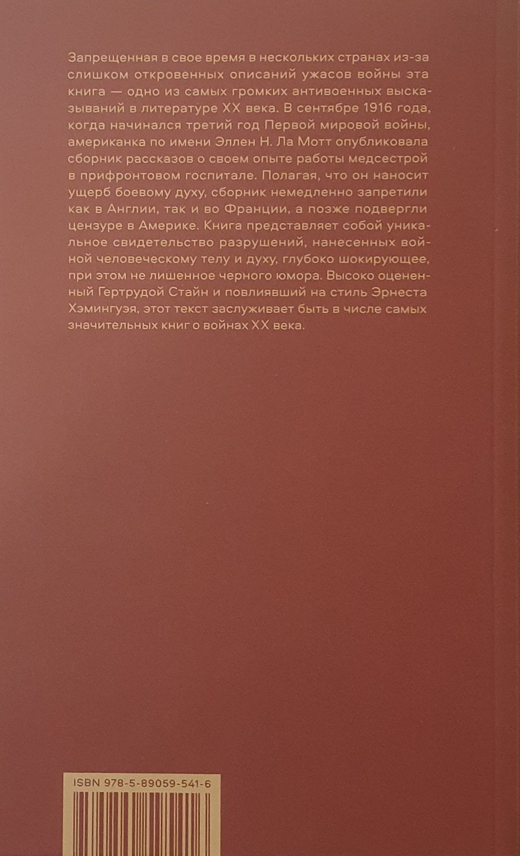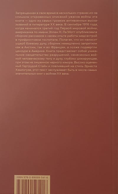 Запрещенная в свое время в нескольких странах из-за слишком откровенных описаний ужасов войны, эта книга - одно из самых громких антивоенных высказываний в литературе XX века. В сентябре 1916 года, когда начинался третий год Первой мировой войны, американка Эллен Н. Ла Мотт опубликовала сборник рассказов о своем опыте работы медсестрой в прифронтовом госпитале. Полагая, что он наносит ущерб боевому духу, сборник немедленно запретили как в Англии, так и во Франции, а позже подвергли цензуре в Америке. Книга представляет собой уникальное свидетельство разрушений, нанесенных войной человеческому телу и духу, глубоко шокирующее, при этом не лишенное черного юмора. Высоко оцененный Гертрудой Стайн и повлиявший на стиль Эрнеста Хэмингуэя, этот текст заслуживает быть в числе самых значительных книг о войнах XX века.