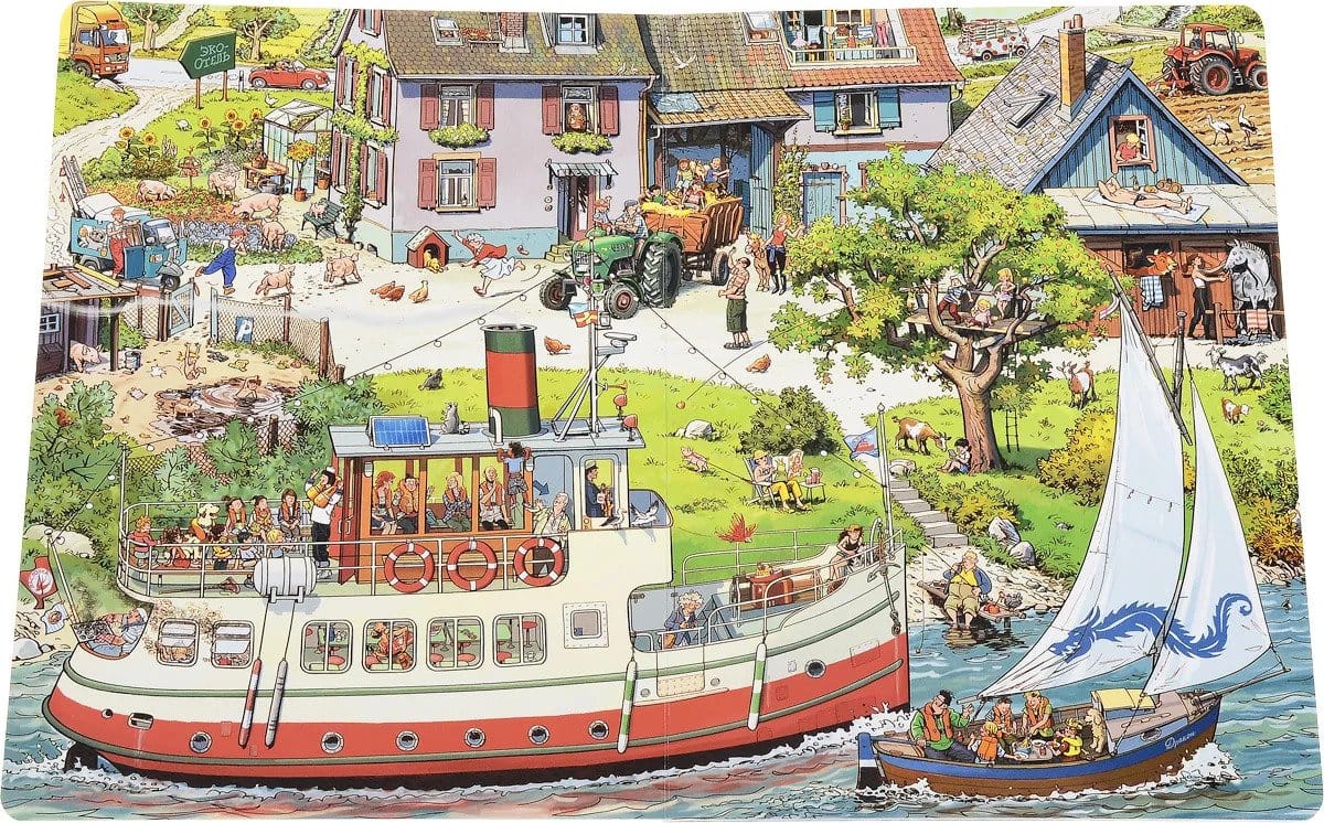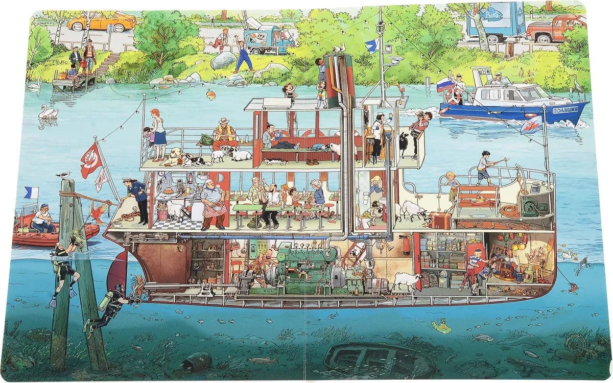 Книга «На реке» расскажет о том, как провели свой день пассажиры теплохода «Ласточка». Рано утром они пришли на пристань небольшого городка, купили билеты и поднялись на борт, где их приветствовали капитан и команда. Затем теплоход отчалил и поплыл вниз по течению, делая по пути остановки – на ферме, у паромной переправы и возле аквапарка под открытым небом. Не обошлось без происшествий: в пути у «Ласточки» сломался винт, и понадобилось вызвать водолазов, чтобы его починить. Наконец, вечером, после всех приключений «Ласточка» прибыла к месту назначения – в большой морской порт, и пассажиры как раз успели к началу большого музыкального фестиваля. Серия «История в картинках» – это настоящее немое кино. Рассматривая книгу без слов, дети научатся видеть и подмечать детали, прослеживать логические связи между событиями, самостоятельно составлять рассказ по картинкам. В книге столько сюжетных линий, что невозможно проследить их все за один раз. Они переплетаются, пересекаются, происходят одновременно, как в настоящем кино – и как в настоящей жизни!