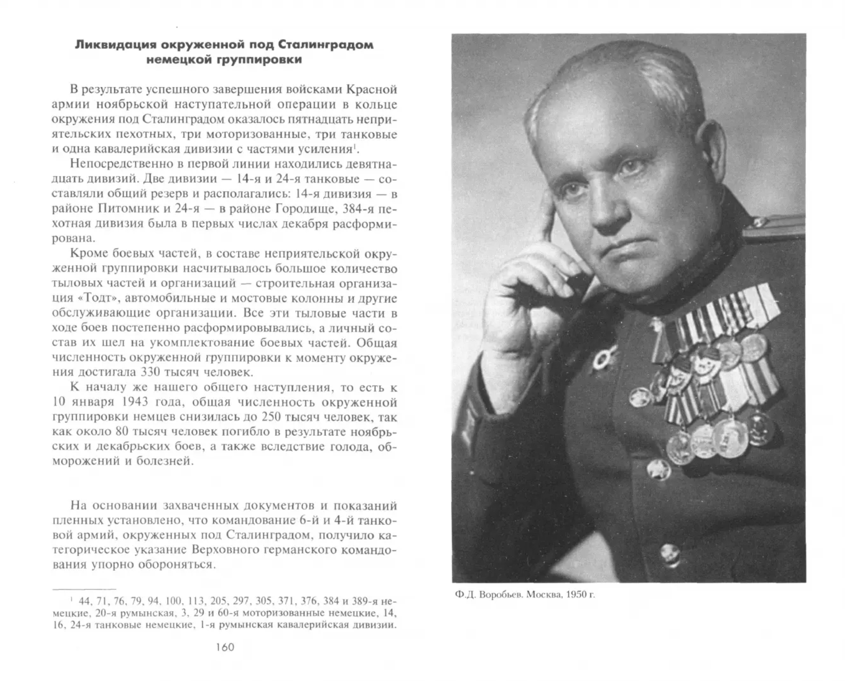 Федор Данилович Воробьев (1904—1992) — полковник, с 1939 г. — офицер Военно-исторического отдела Генерального штаба Красной армии, один из первых исследователей истории Великой Отечественной войны 1941—1945 годов. В силу должностных обязанностей стал свидетелем многих ключевых событий Великой Отечественной войны. В должности офицера Генерального штаба он работал на Волховском фронте в 1941 — начале 1942 гг., а затем уже как военный историк непосредственно в войсках изучал события Сталинградской битвы, сражения на Курской дуге, освобождения Украины, Берлинского сражения и других. Собранный оперативный материал, данные разведки, трофейные документы немедленно анализировались, обобщались и публиковались в виде военно-стратегических очерков, целевой аудиторией которых был высший и старший командный состав Красной армии. Ф.Д. Воробьев является автором ряда очерков, приведенных в этой книге, а также соавтором фундаментальных трудов: «Оборона Севастополя» (М., 1943), «Битва под Сталинградом» (М., 1944), «Десять сокрушительных ударов» (М.,1945), «Битва под Курском» в двух книгах (М., 1946—1947), «Берлинская операция 1945 года» (М.,1950) и др.