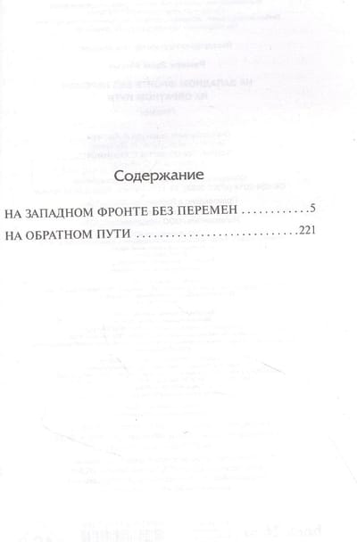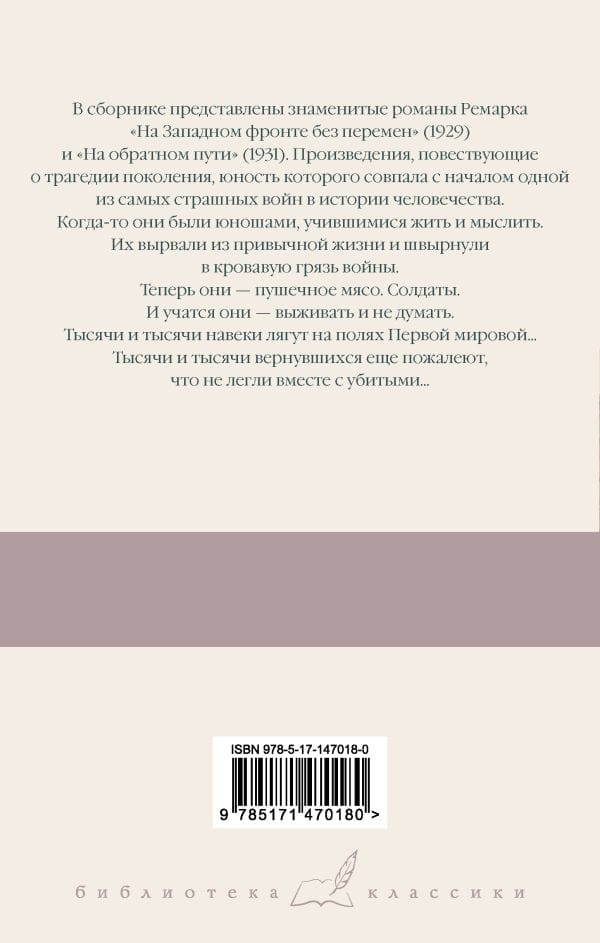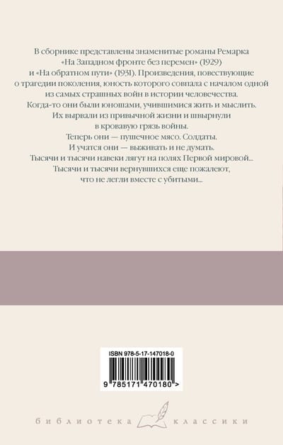 В сборнике представлены знаменитые романы Ремарка «На Западном фронте без перемен» (1929) и «На обратном пути» (1931). Произведения, повествующие о трагедии поколения, юность которого совпала с началом одной из самых страшных войн в истории человечества. Когда-то они были юношами, учившимися жить и мыслить. Их вырвали из привычной жизни и швырнули в кровавую грязь войны. Теперь они — пушечное мясо. Солдаты. И учатся они — выживать и не думать. Тысячи и тысячи навеки лягут на полях Первой мировой... Тысячи и тысячи вернувшихся еще пожалеют, что не легли вместе с убитыми...