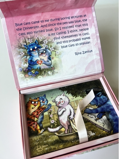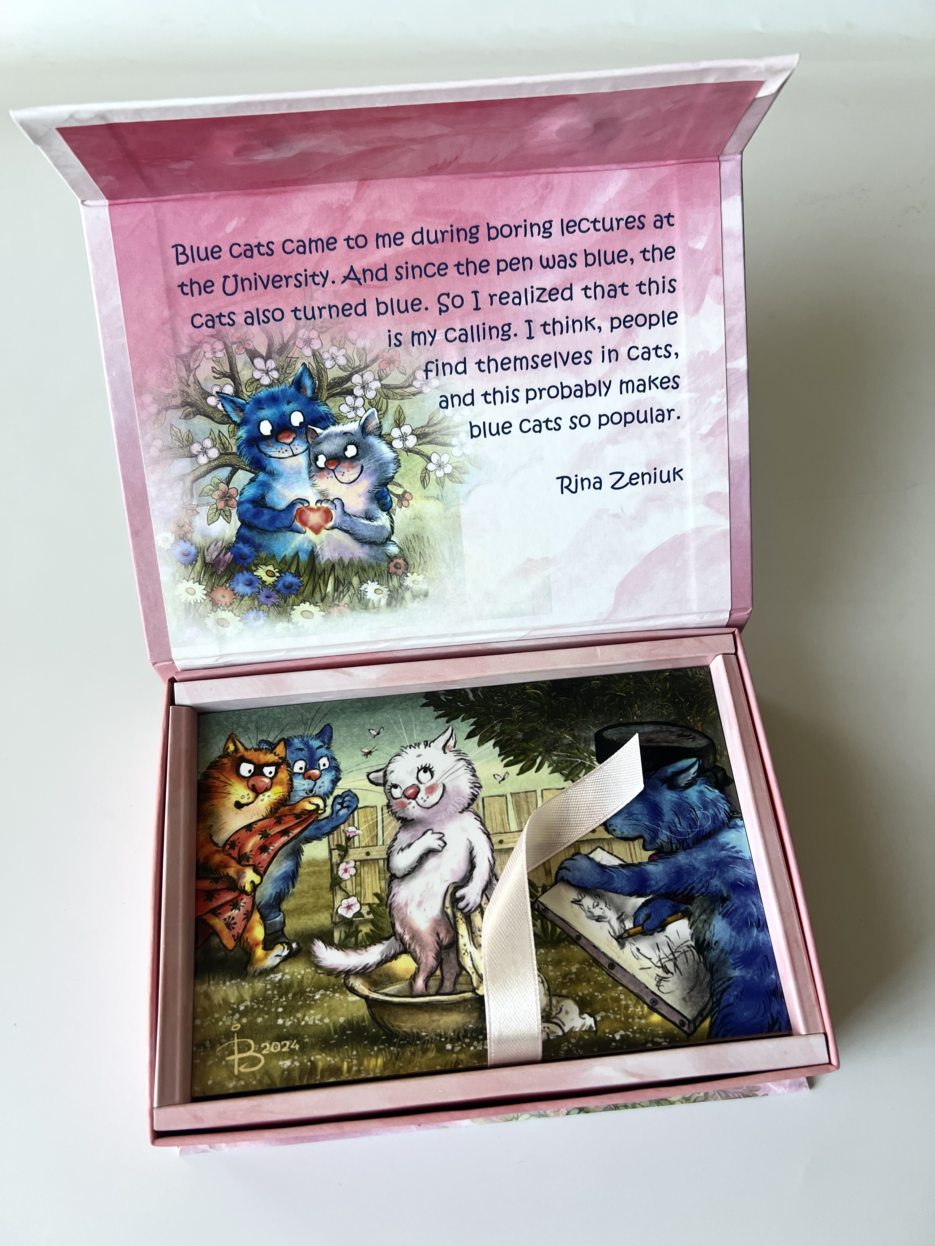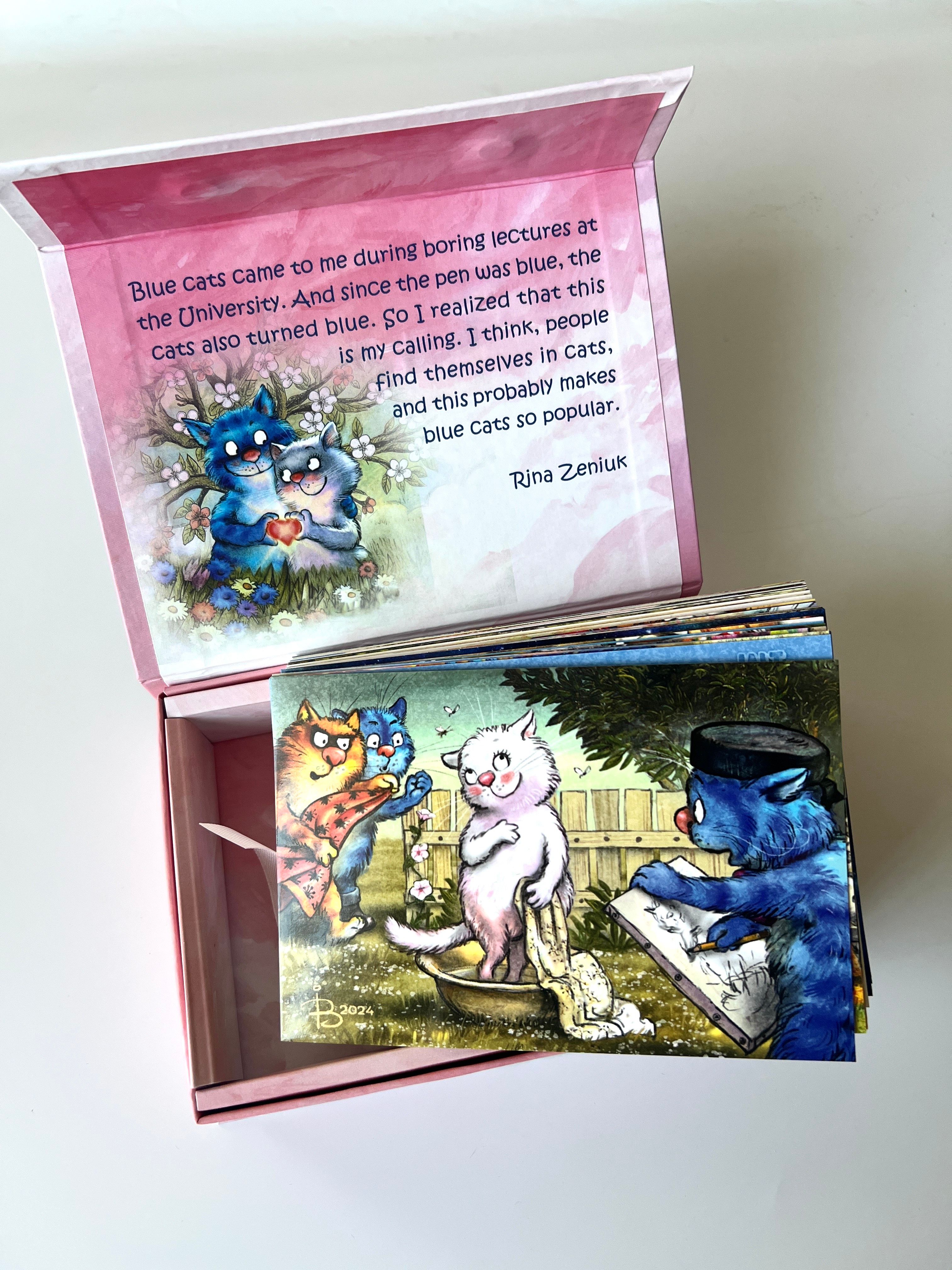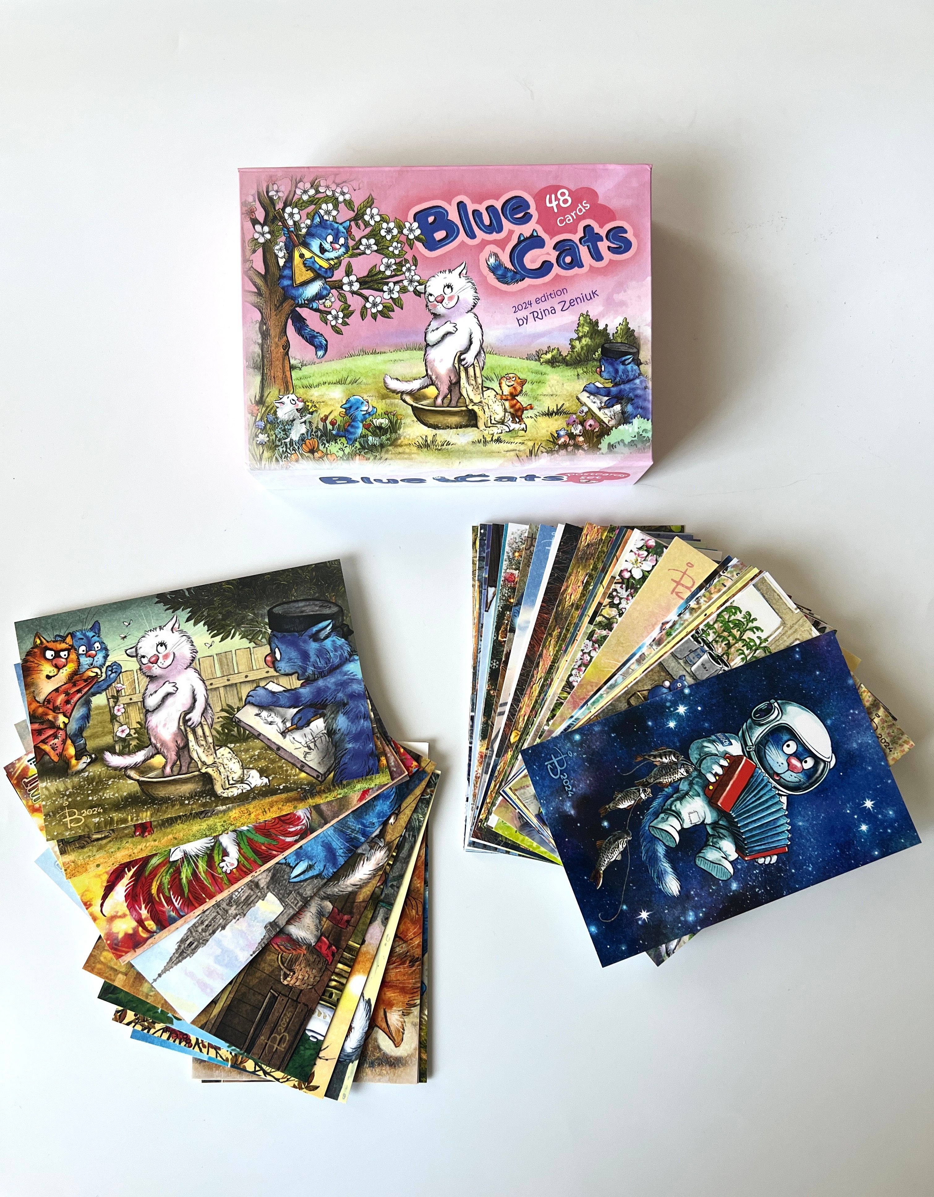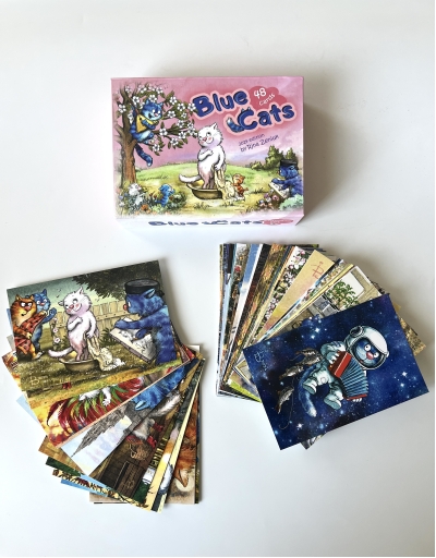 Красивые и забавные почтовые открытки с синими котами обязательно понравятся получателю, поскольку рисунки Ирины Зенюк очень милые и продуманы до мелочей.