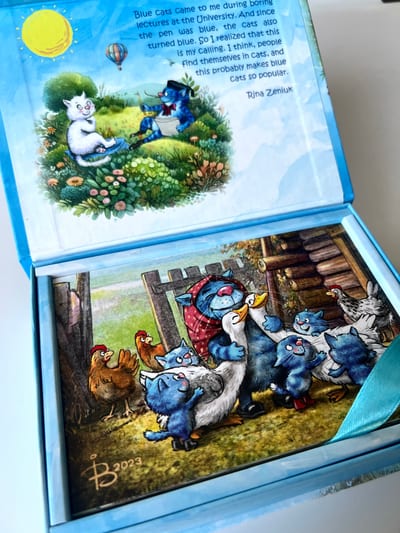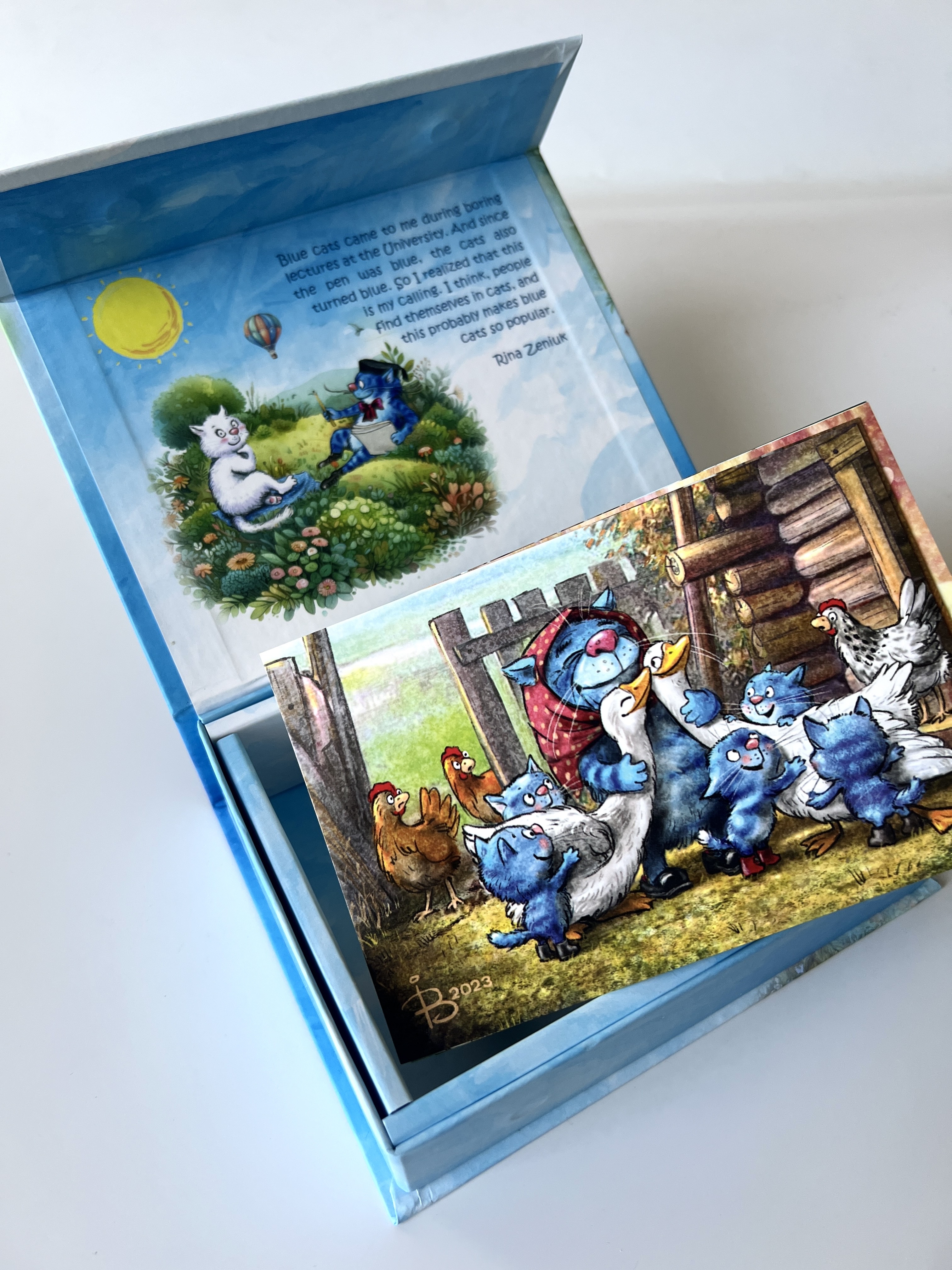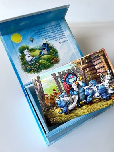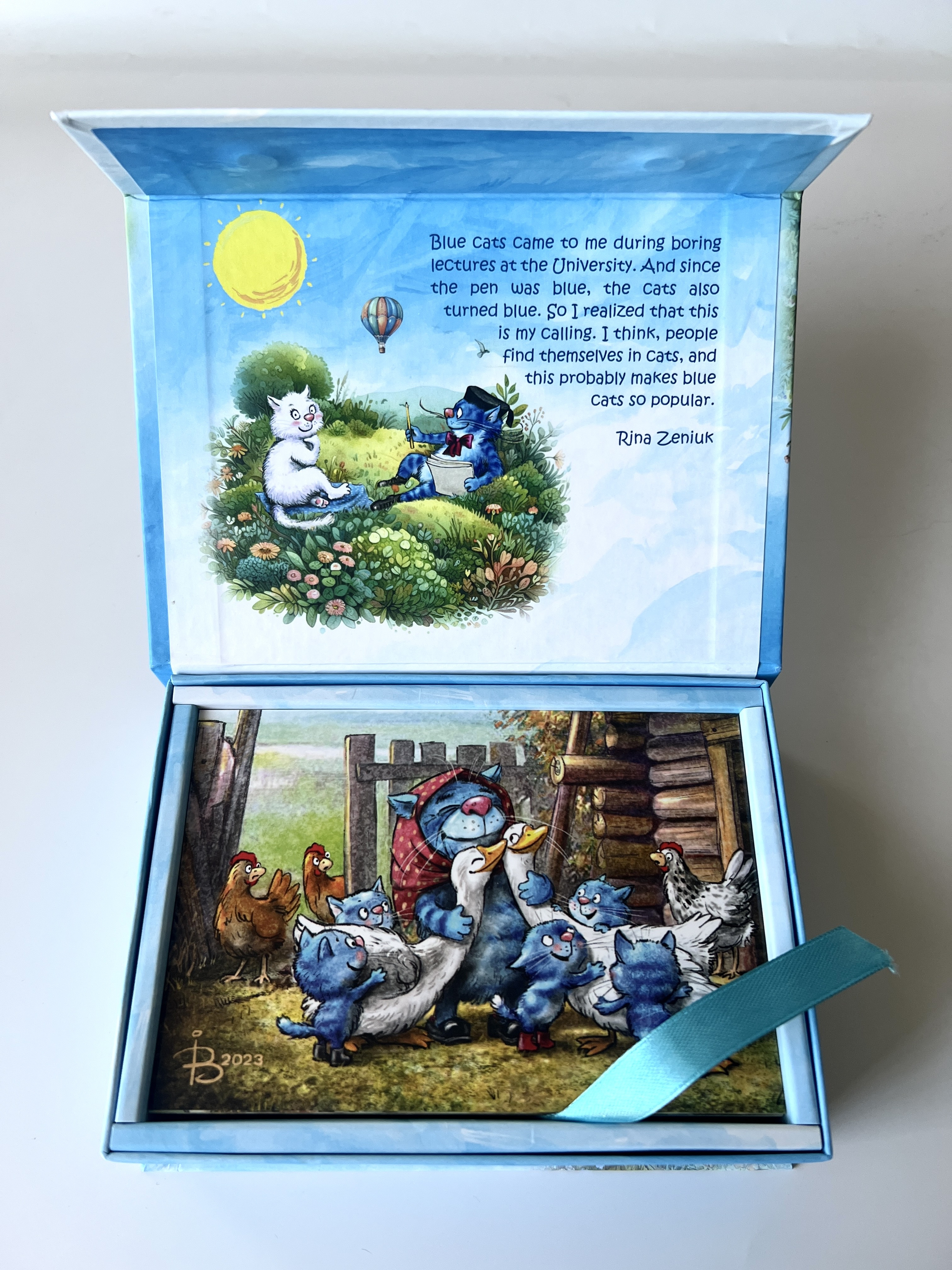 Красивые и забавные почтовые открытки с синими котами обязательно понравятся получателю, поскольку рисунки Ирины Зенюк очень милые и продуманы до мелочей.