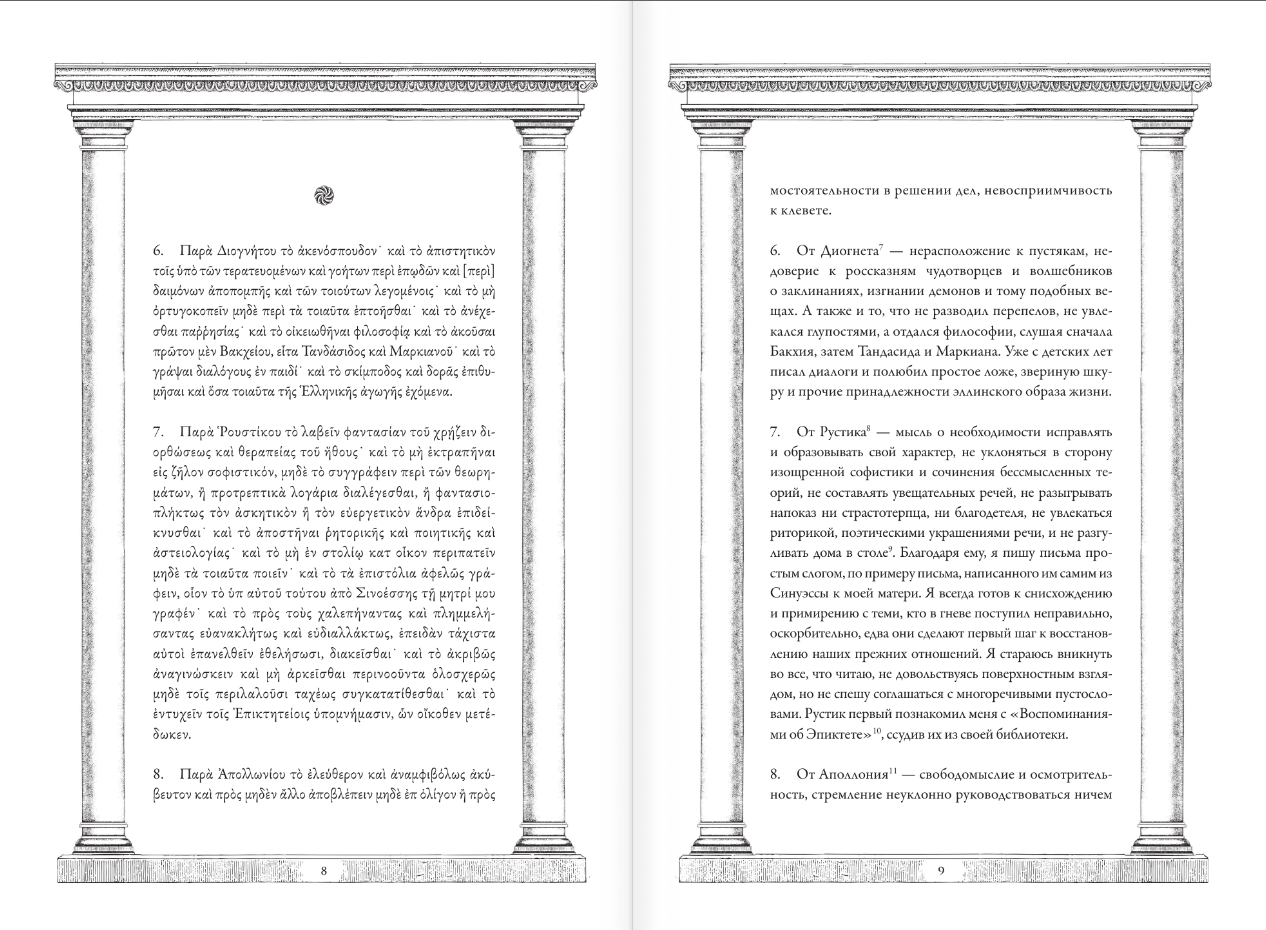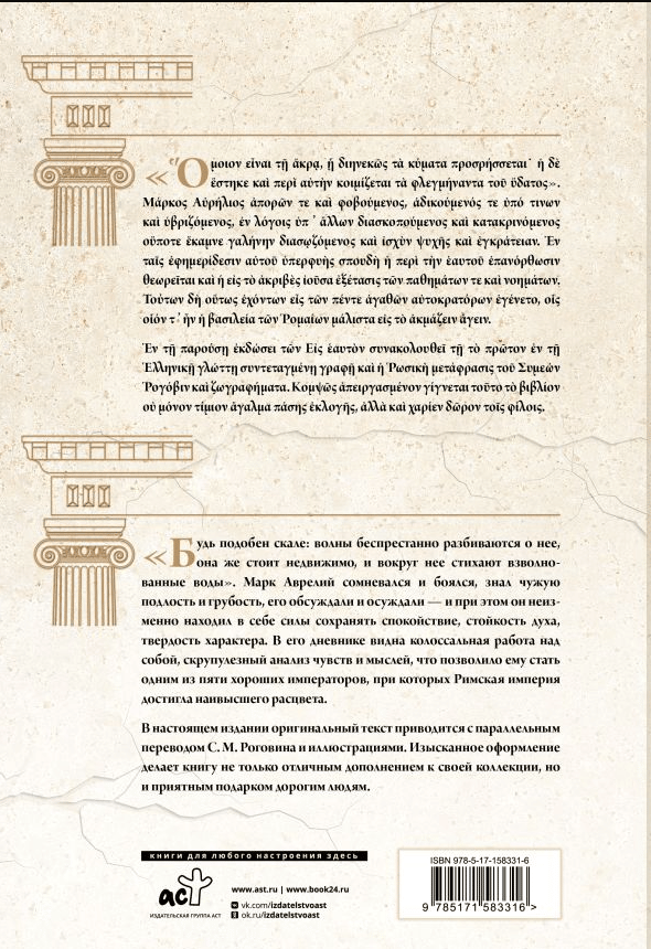 «Будь подобен скале: волны беспрестанно разбиваются о нее, она же стоит недвижимо, и вокруг нее стихают взволнованные воды». Марк Аврелий сомневался и боялся, знал чужую подлость и грубость, его обсуждали и осуждали — и при этом он неизменно находил в себе силы сохранять спокойствие, стойкость духа, твердость характера. В его дневнике видна колоссальная работа над собой, скрупулезный анализ чувств и мыслей, что позволило ему стать одним из пяти хороших императоров, при которых Римская империя достигла наивысшего расцвета.