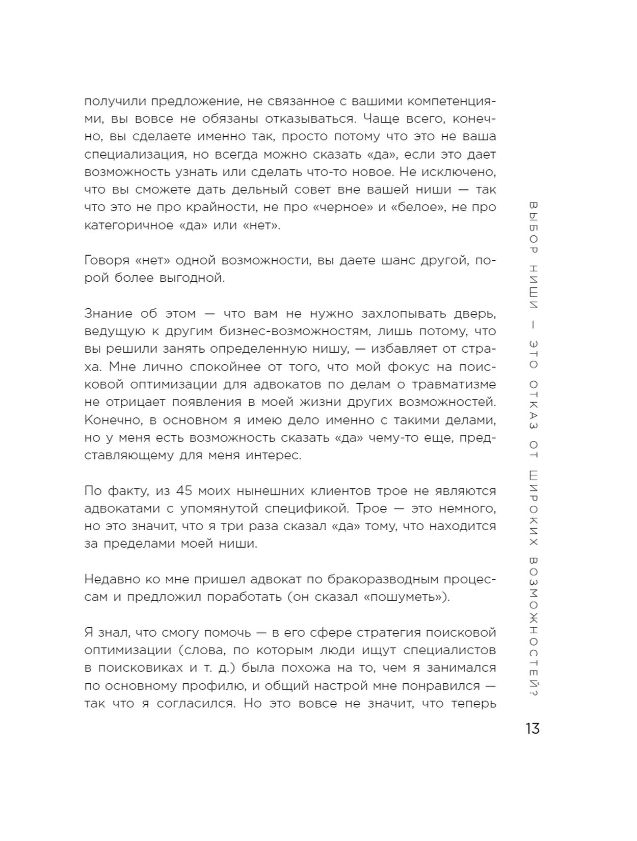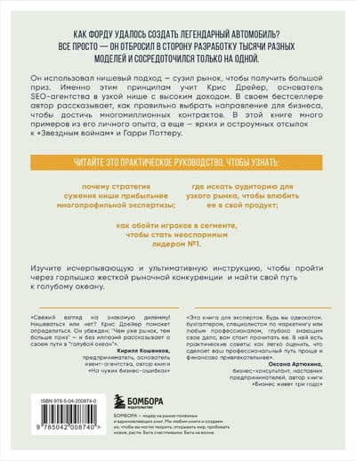 Он использовал нишевый подход — сузил рынок, чтобы сорвать большой приз. Именно этим принципам учит Крис Дрейер, основатель SEO-агентства в узкой нише с высоким доходом. В своем бестселлере автор рассказывает, как правильно выбрать направление для бизнеса, чтобы получать многомиллионные обороты. В этой книге много примеров из мировой практики, а еще — ярких и остроумных отсылок к «Звездным войнам» и Гарри Поттеру.
