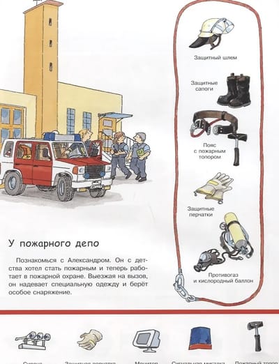 На каждом книжном развороте внимание Вашего малыша привлекут красочные сюжетные изображения различных жизненных ситуаций, связанных с работой пожарной службы. Это и показанные в разрезе все необходимые подразделения пожарной части и её диспетчерского центра, последовательность действий сотрудников пожарной охраны при вызове на тушение пожара или в случае другой экстремальной ситуации, разнообразные виды специальной пожарной техники и особого пожарного снаряжения.