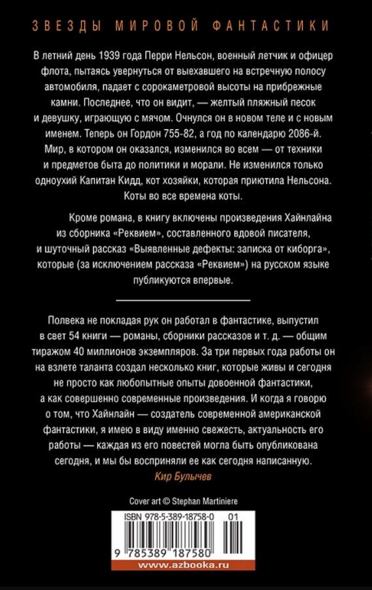 В летний день 1939 года Перри Нельсон, военный летчик и офицер флота, пытаясь увернуться от выехавшего на встречную полосу автомобиля, падает с сорокаметровой высоты на прибрежные камни. Последнее, что он видит, — желтый пляжный песок и девушку, играющую с мячом. Очнулся он в новом теле и с новым именем. Теперь он Гордон 755-82, а год по календарю 2086-й. Мир, в котором он оказался, изменился во всем — от техники и предметов быта до политики и морали. Не изменился только одноухий Капитан Кидд, кот хозяйки, которая приютила Нельсона. Коты во все времена коты.