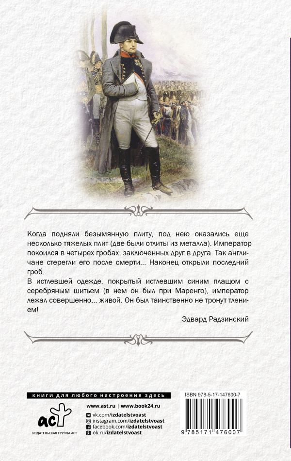 Когда подняли безымянную плиту, под нею оказались еще несколько тяжелых плит (две были отлиты из металла). Император покоился в четырех гробах, заключенных друг в друга. Так англичане стерегли его после смерти… Наконец открыли последний гроб. В истлевшей одежде, покрытый истлевшим синим плащом с серебряным шитьем (в нем он был при Маренго), император лежал совершенно… живой. Он был таинственно не тронут тлением! Эдвард Радзинский