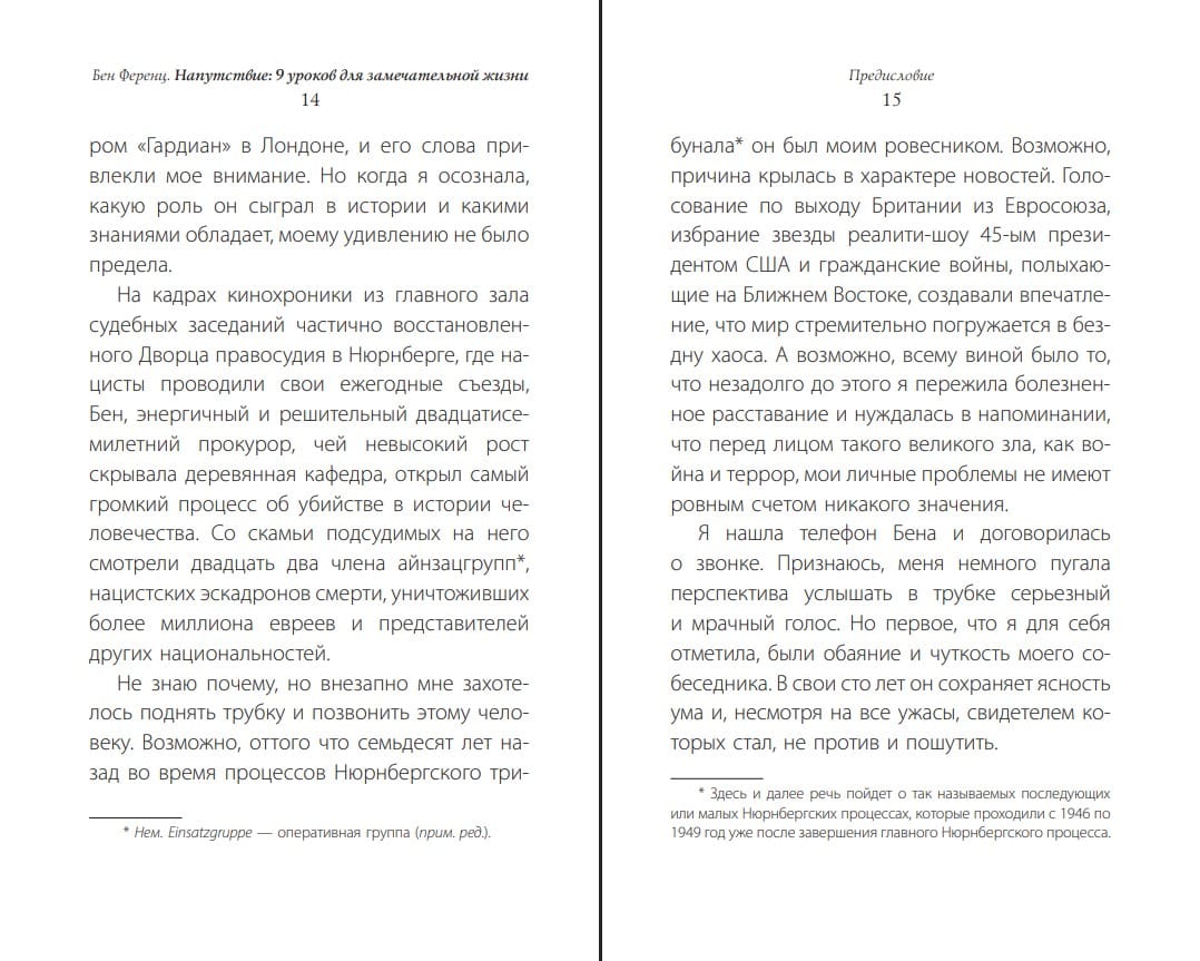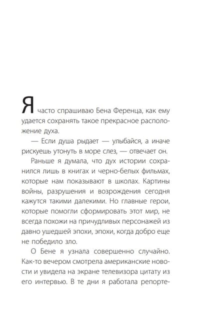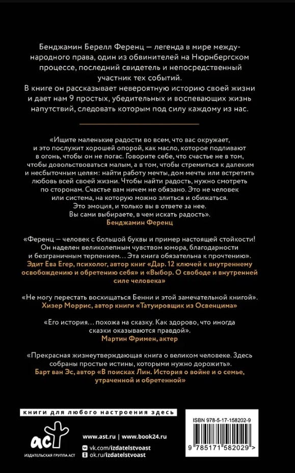 Бенджамин Берелл Ференц — легенда в мире международного права, один из обвинителей на Нюренбергском процессе, последний свидетель и непосредственный участник тех событий. В книге он рассказывает невероятную историю своей жизни, и дает нам 9 простых, убедительных и воспевающих жизнь напутствий, следовать которым под силу каждому из нас.