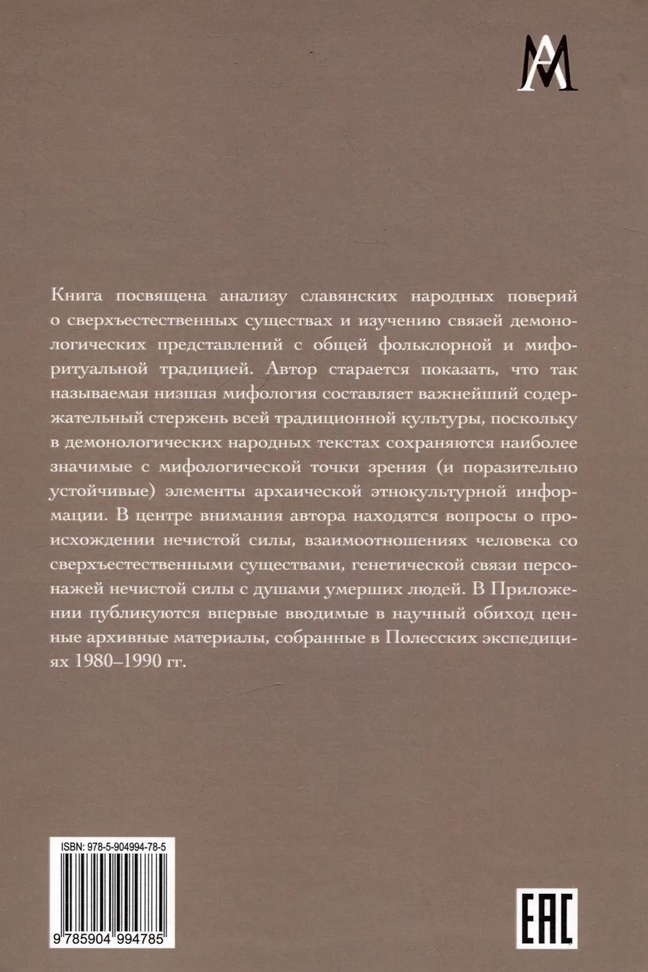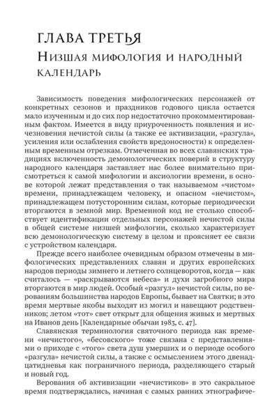 Книга посвящена анализу славянских народных поверий о сверхъестественных существах и изучению связей демонологических представлений с общей фольклорной и мифо-ритуальной традицией. Автор старается показать, что так называемая низшая мифология составляет важнейший содержательный стержень всей традиционной культуры, поскольку в демонологических народных текстах сохраняются наиболее значимые с мифологической точки зрения (и поразительно устойчивые) элементы архаической этнокультурной информации. В центре внимания автора находятся вопросы о происхождении нечистой силы, взаимоотношениях человека со сверхъестественными существами, генетической связи персонажей нечистой силы с душами умерших людей. В Приложении публикуются впервые вводимые в научный обиход ценные архивные материалы, собранные в Полесских экспедициях 1980–1990гг.