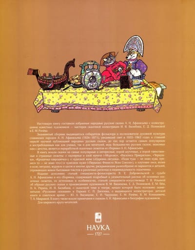 Настоящую книгу составили избранные народные русские сказки А. Н. Афанасьева с иллюстрациями известных художников — мастеров сказочной иллюстрации И. Я. Билибина, Е. Д. Поленовой и Е. М. Рачёва.