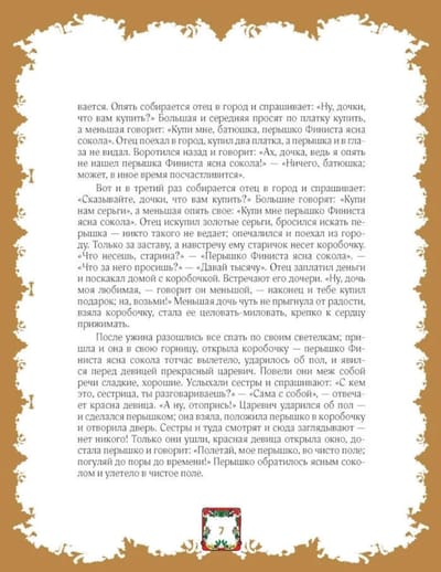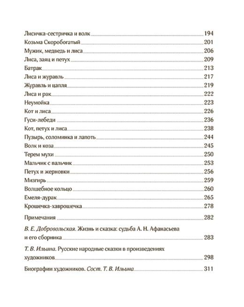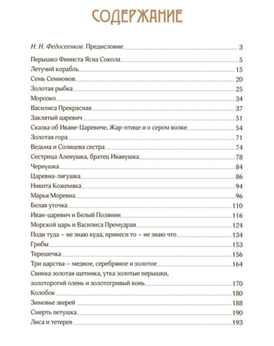 В книгу вошли сказки на самые популярные и интересные, порой шуточные, а порой таинственные и страшные сюжеты: о падчерице и злой мачехе («Морозко», «Василиса Прекрасная», «Чернушка», «Крошечка-хаврошечка»), о чудесной жене («Царевна-лягушка», «Поди туда — не знаю куда, принеси то — не знаю что») и чудесном муже («Перышко Финиста Ясна Сокола»), о плутовке-лисе, волке и козе, петушке, журавле и цапле и многие другие, раскрывающие разнообразие их вариантов и деталей, отражающих живое бытование текстов в различных регионах и индивидуальность сказочника.