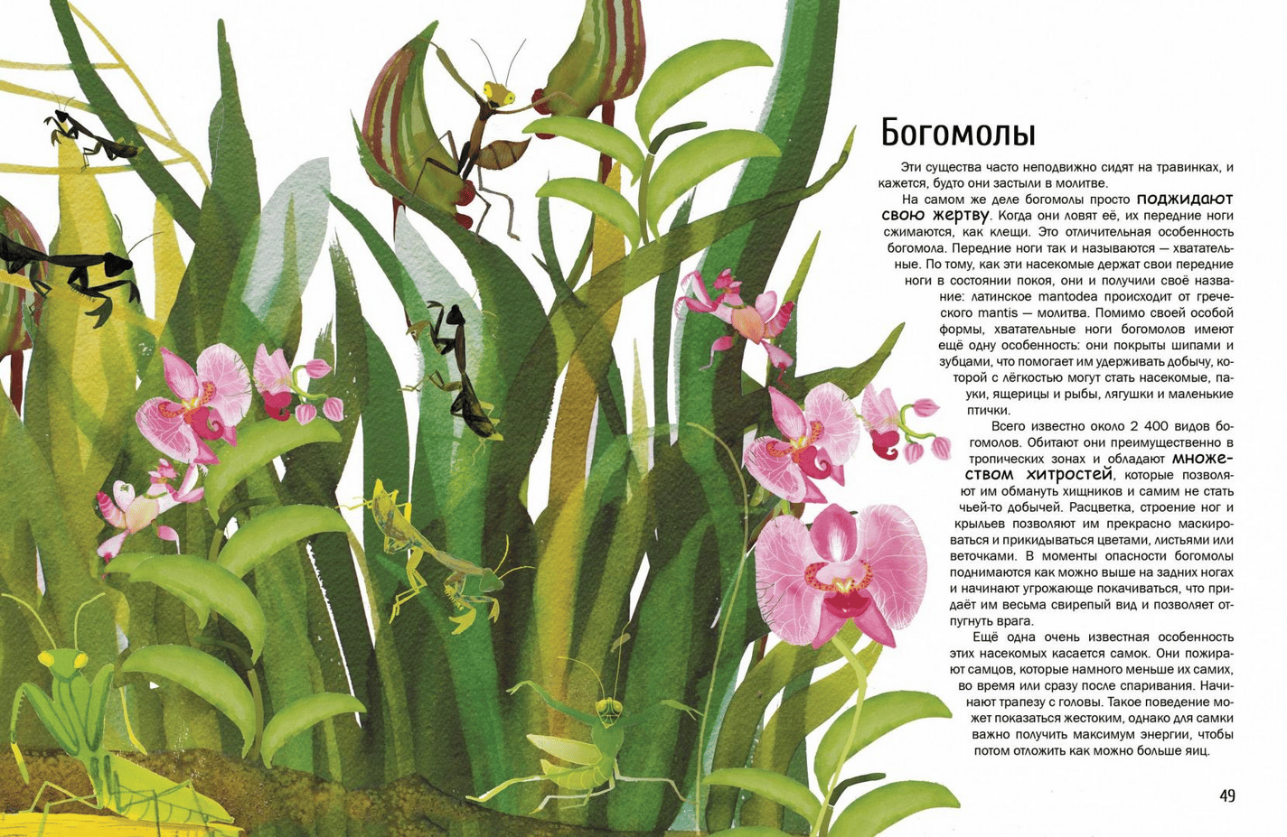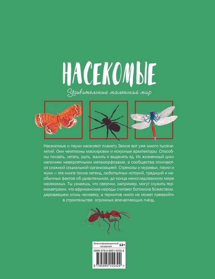 Насекомые и пауки населяют планету Земля вот уже много тысячелетий. Они чемпионы маскировки и искусные архитекторы. Способны ползать, летать, рыть, жалить и выделять яд. Их жизненный цикл наполнен невероятными метаморфозами, а сообщества отличаются сложной социальной организацией. Стрекозы и муравьи, пауки и жуки — эта книга полна легенд, любопытных историй, традиций и необычных фактов об удивительном, до конца неисследованном мире насекомых. Ты узнаешь, что сверчки, например, могут служить термометрами, что африканские народы считают богомола божеством, даровавшем огонь человеку, а термитов никто не может превзойти в строительстве огромных впечатляющих гнёзд. Для детей среднего школьного возраста.