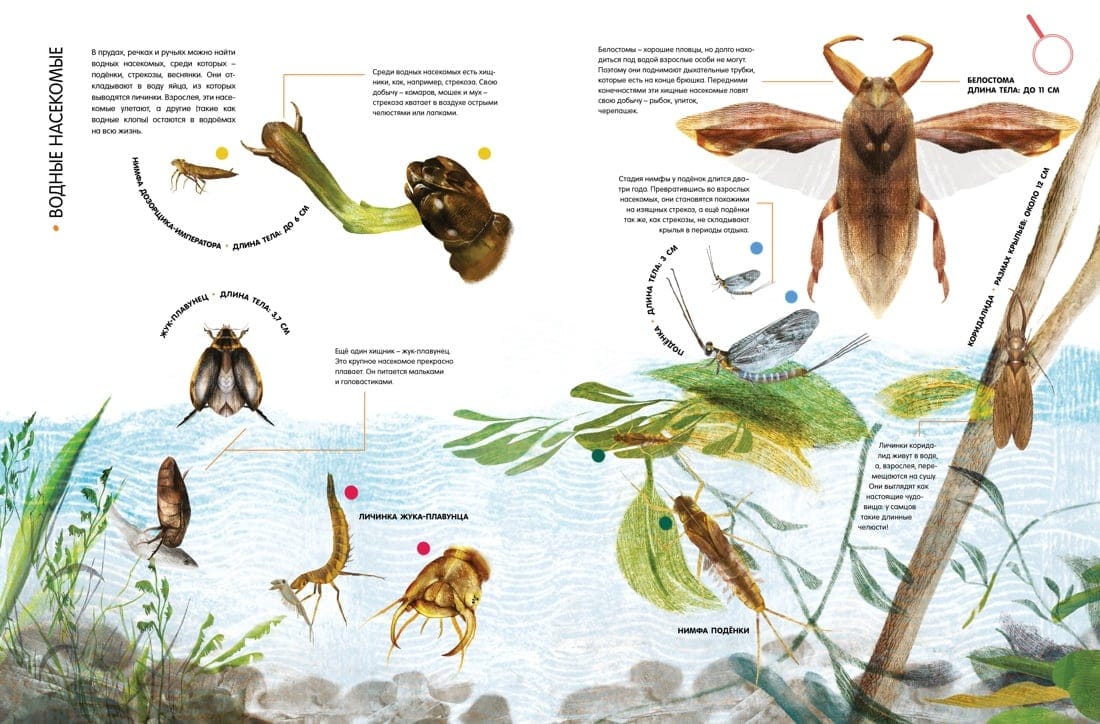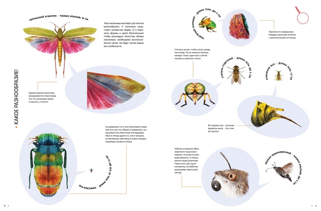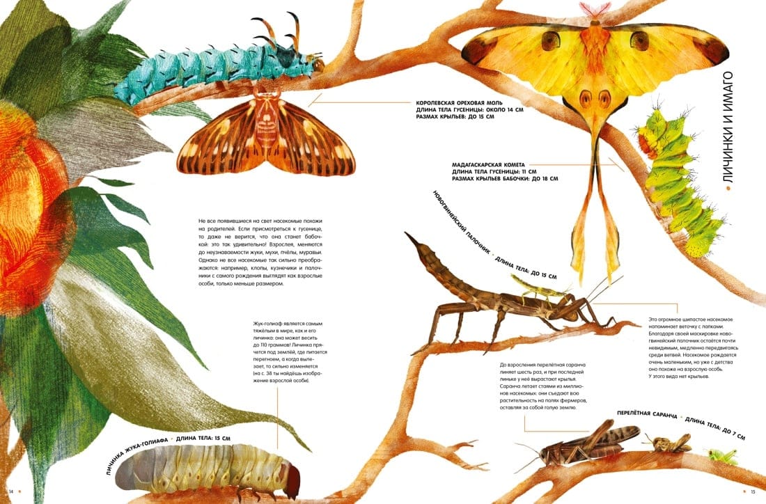 Кто крупнее – жук-геркулес или рогач-жираф? Почему богомола так назвали? Где живёт большая гарпия? На страницах этой книги ты можешь увидеть удивительных насекомых нашей планеты – мадагаскарскую комету, королевскую ореховую моль, жука-голиафа, белостому, рассмотреть жало бумажной осы, заднее крыло перуанского кузнечика, пчелиные соты. Большинство рисунков выполнено в натуральную величину! Книга содержит много интересной информации об ареале обитания насекомых, их размерах, особенностях, а также о способах маскировки от хищников. Рассмотри насекомых поближе и прочти факты о них: тебе откроется много секретов природного мира!