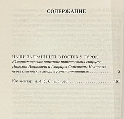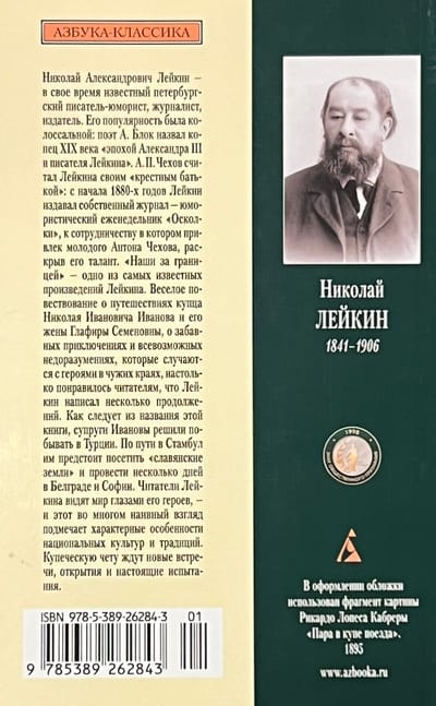 «Наши за границей» — одно из самых известных произведений Лейкина. Веселое повествование о путешествиях купца Николая Ивановича Иванова и его жены Глафиры Семеновны, о забавных приключениях и всевозможных недоразумениях, которые случаются с героями в чужих краях, настолько понравилось читателям, что Лейкин написал несколько продолжений. Как следует из названия этой книги, супруги Ивановы решили побывать в Турции. По пути в Стамбул им предстоит посетить «славянские земли» и провести несколько дней в Белграде и Софии. Читатели Лейкина видят мир глазами его героев, — и этот во многом наивный взгляд подмечает характерные особенности национальных культур и традиций. Купеческую чету ждут новые встречи, открытия и настоящие испытания.