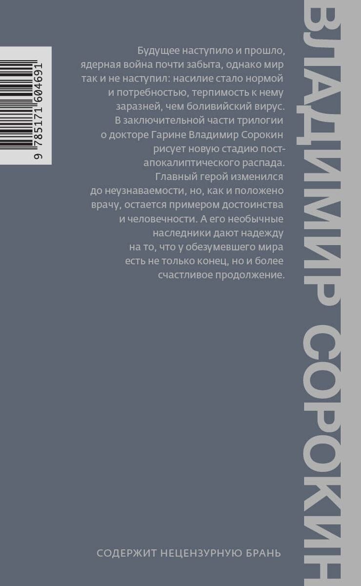 В заключительной части трилогии о докторе Гарине Владимир Сорокин рисует следующую, еще более далекую от нас стадию постапокалиптического распада. Но ее реальность парадоксальным образом кажется куда более узнаваемой. Правда, главного героя мы узнаем не сразу, зато он по‑прежнему, как и положено врачу, остается примером достоинства и человечности. Поезд, неизменный образ, соединяющий русскую, советскую и постсоветскую литературы, идет с востока на запад. Его топливо — люди, не в метафорическом, а в буквальном смысле, и им некуда больше бежать. Но чудесный доктор и его необычные наследники дают надежду на то, что у обезумевшего мира есть не только конец, но и более счастливое продолжение.