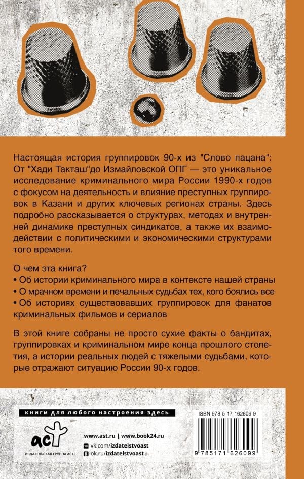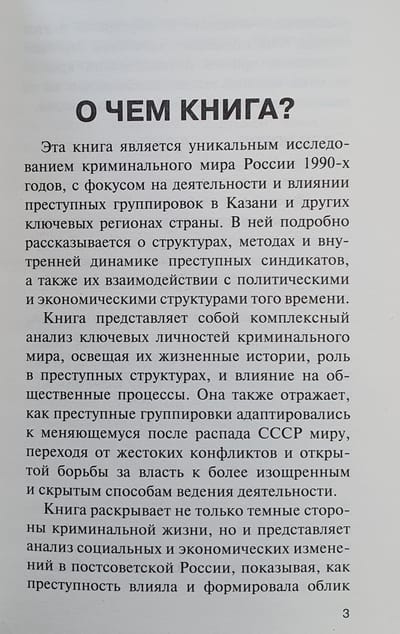 От «Хади Такташ» до Измайловской ОПГ — это уникальное исследование криминального мира России 1990-х годов с фокусом на деятельность и влияние преступных группировок в Казани и других ключевых регионах страны. Здесь подробно рассказывается о структурах, методах и внутренней динамике преступных синдикатов, а также их взаимодействии с политическими и экономическими структурами того времени. О чем эта книга? • Об истории криминального мира в контексте нашей страны; • О мрачном времени и печальных судьбах тех, кого боялись все; • Об историях существовавших группировок для фанатов криминальных фильмов и сериалов. В этой книге собраны не просто сухие факты о бандитах, группировках и криминальном мире конца прошлого столетия, а истории реальных людей с тяжелыми судьбами, которые отражают ситуацию России 90-х годов.