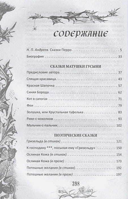 Опасно детям слушать злых людей, Особенно ж девицам И стройным, и прекраснолицым. Совсем не диво и не чудо Попасть волкам на третье блюдо. «Красная Шапочка». Шарль Перро Полное собрание сказок Шарля Перро в неадаптированных переводах для взрослых. В России сказки Перро давно приобрели всеобщую известность — детям многих поколений хорошо знакомы Кот в сапогах, Золушка, Мальчик-с-пальчик и Красная Шапочка. Но всё это были адаптированные версии сказок. Советские издатели, стремясь приспособить их под детское восприятие, часто перегибали палку. В те времена уже устоялось мнение, что сказки должны обязательно заканчиваться хорошо. Например, после 1945 г. все издания «Красной Шапочки» имели счастливый конец: в финале волку разрезают живот и спасают девочку. У Перро же сказка завершается трагически. В его версии Красная Шапочка нарушила правила приличия и поплатилась за это жизнью. В данный сборник вошли все сказки Перро — прозаические и стихотворные — в неадаптированных переводах, изданных редакцией Михаила Александровича Петровского. А также наиболее известные сказки его продолжателей и последователей — как образцы французской сказочной литературы XVII—XVIII веков. Книга иллюстрирована гравюрами Гюстава Доре, а также великолепными рисунками Джона Гилберта, Уолтера Крейна, Джона Баттена, Анри де Монто, Жюля-Мари Дезандре, Клемана-Пьера Марилье, и Александра Дмитриевича Силина, представляющими большую историческую и художественную ценность.