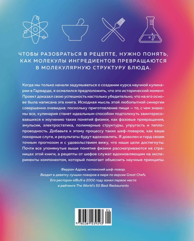 «Поварам во всем мире известна истина: кулинария — это наука, а наука — это кулинария. На протяжении истории множество удивительных открытий было сделано учеными, работавшими с продуктами, и поварами, использовавшими научный подход. Николя Аппер, французский кондитер и химик, в начале XIX века стал изобретателем процесса консервации, нового способа безопасного хранения продуктов. Технология пастеризации, предложенная микробиологом Луи Пастером, произвела революцию в пищевой промышленности — и, вероятно, спасла за время своего существования миллионы жизней. В этой книге мы рассматриваем еду как науку, но еда — это также история, культура, дипломатия, национальная безопасность и еще очень и очень многое. Общество станет сильнее, если мы будем лучше понимать, откуда берется еда и насколько сильно это влияет на окружающий мир. Вот почему эта книга — и гарвардский курс, на котором она основана, — является столь значимым ресурсом. Интересная для всех, а не только для изучающих точные науки, она поможет читателям установить связи и создать системную картину увлекательного мира еды». Хосе Андрес, американский шеф-повар. Обладатель наград «Шеф 2009 года», «Выдающийся шеф» по версии James Beard Foundation и премии «Человек года 2009» по версии журнала GQ.