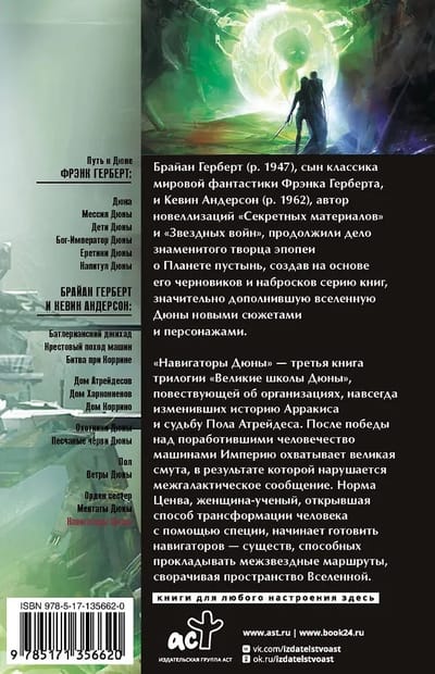 «Навигаторы Дюны» – третья книга трилогии «Великие школы Дюны», повествующей об организациях, навсегда изменивших историю Арракиса и судьбу Пола Атрейдеса.