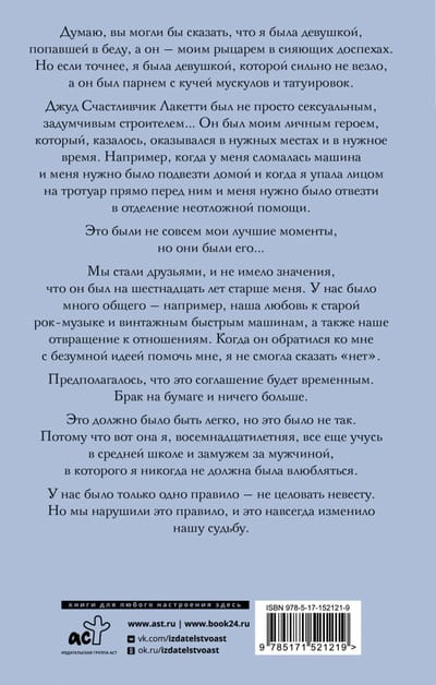 Мы стали друзьями, и не имело значения, что он был на шестнадцать лет старше меня. У нас было много общего — например, наша любовь к старой рок-музыке и винтажным быстрым машинам, а также наше отвращение к отношениям. Когда он обратился ко мне с безумной идеей помочь мне, я не смогла сказать «нет». Предполагалось, что это соглашение будет временным. Брак на бумаге и ничего больше. Это должно было быть легко, но это было не так. Потому что вот она я, восемнадцатилетняя, все еще учусь в средней школе и замужем за мужчиной, в которого я никогда не должна была влюбляться. У нас было только одно правило — не целовать невесту. Но мы нарушили это правило, и это навсегда изменило нашу судьбу.