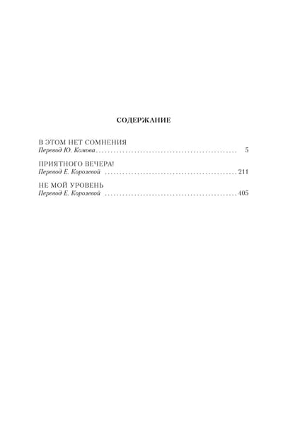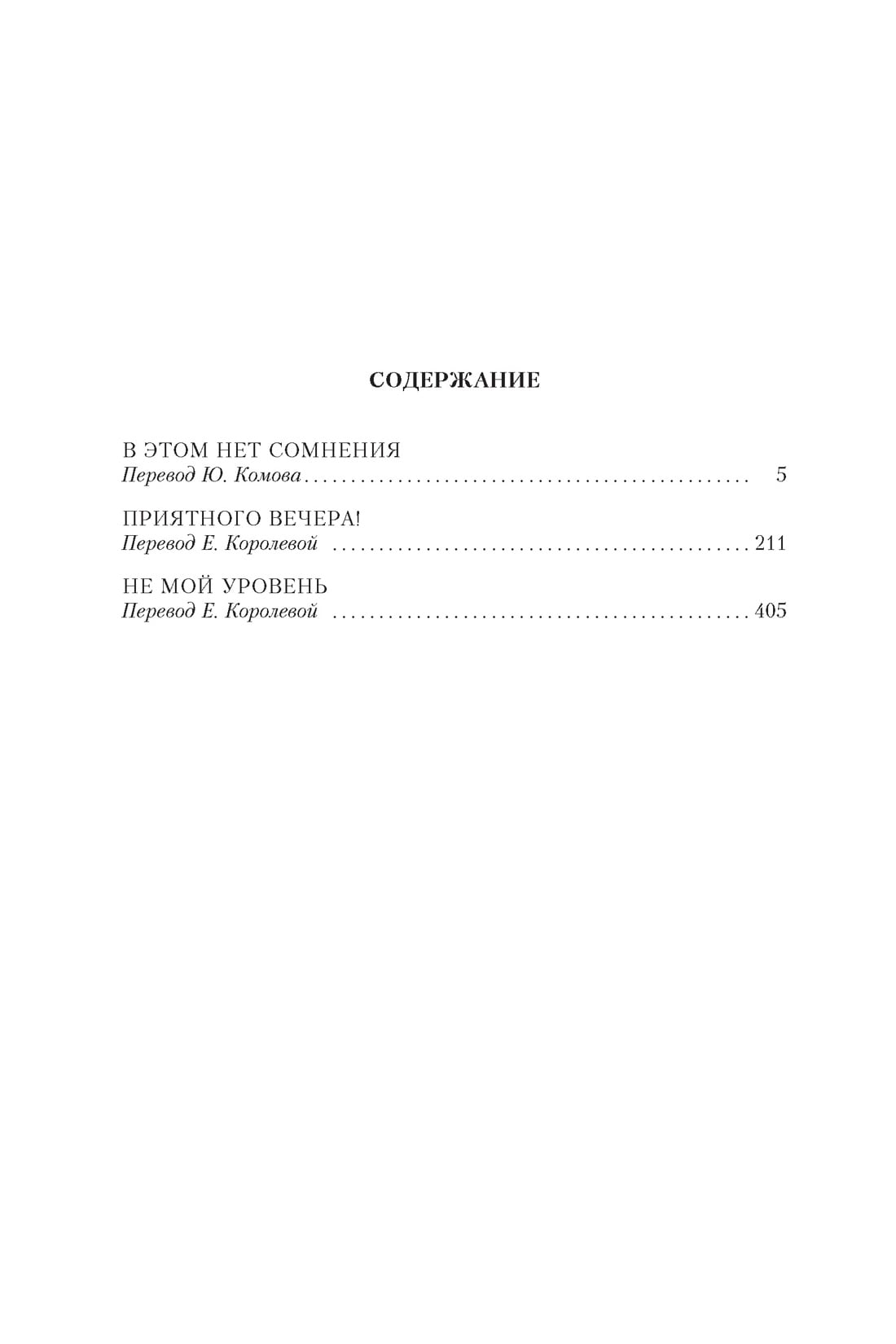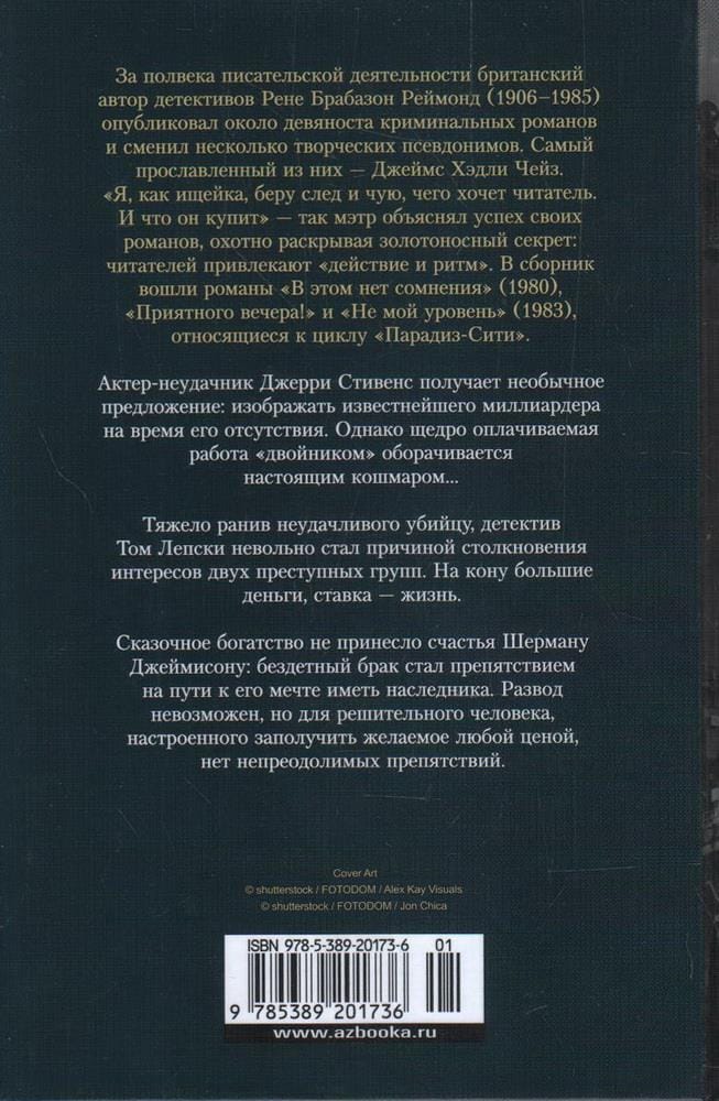 За полвека писательской деятельности британский автор детективов Рене Брабазон Реймонд (1906–1985) опубликовал около девяноста криминальных романов и сменил несколько творческих псевдонимов. Самый прославленный из них — Джеймс Хэдли Чейз. «Я, как ищейка, беру след и чую, чего хочет читатель. И что он купит» — так мэтр объяснял успех своих романов, охотно раскрывая золотоносный секрет: читателей привлекают «действие и ритм». В сборник вошли романы «В этом нет сомнения» (1980), «Приятного вечера» и «Не мой уровень» (1983), относящиеся к циклу «Парадиз-Сити». Актер-неудачник Джерри Стивенс получает необычное предложение: изображать известнейшего миллиардера на время его отсутствия. Однако щедро оплачиваемая работа «двойником» оборачивается настоящим кошмаром... Тяжело ранив неудачливого убийцу, детектив Том Лепски невольно стал причиной столкновения интересов двух преступных групп. На кону большие деньги, ставка — жизнь. Сказочное богатство не принесло счастья Шерману Джеймисону: бездетный брак стал препятствием на пути к его мечте иметь наследника. Развод невозможен, но для решительного человека, настроенного заполучить желаемое любой ценой, нет непреодолимых препятствий.