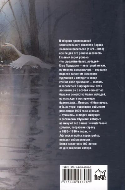 В сборник произведений замечательного писателя Бориса Львовича Васильева (1924—2013) вошли два его романа и повесть. Главный герой романа «Не стреляйте белых лебедей» Егор Полушкин — непутевый мужик, по мнению односельчан, — оказался наделен талантом истинного художника и находит в конце концов свое призвание — любить и заботиться о прекрасном. Став лесничим, он с особой нежностью бережет семейство белых лебедей, но однажды в лес приходят браконьеры… Повесть «И был вечер, и было утро» посвящена событиям революции 1905 года, а роман «Глухомань» о людях, живущих в российской глубинке, которых не минуют все самые значительные события, потрясшие страну в 1980—1990-х годах, — Афганская война, перестройка, передел собственности…