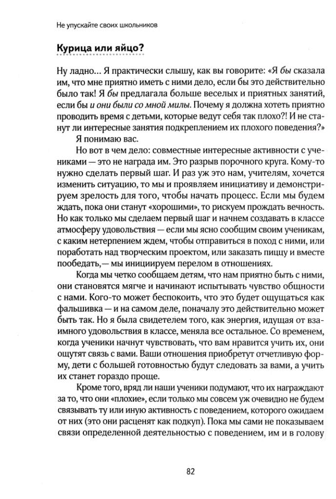 Именно тому, как добиться доверия детей, завоевать у них авторитет без фамильярности и панибратства, посвящена книга «Не упускайте своих школьников» Ханны Бич и Тамары Ньюфелд Страйджек. Она окажет неоценимую поддержку и родителям и учителям, когда они сталкиваются с проблемным поведением и сложностями в обучении. Научившись понимать причины такого поведения и эмоциональные потребности каждого ребенка, вы сами удивитесь, насколько легче будет работать в атмосфере дружелюбия и взаимопонимания, по-новому взглянете на свое призвание и обретете второе дыхание.