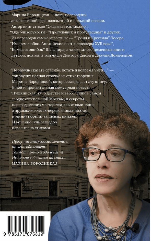«Не забудь сказать спасибо, встать и вовремя уйти...» — так звучит полная строчка из стихотворения Марины Бородицкой, которое закрывает эту книгу поистине лоскутной прозы. В ней и пронзительная мемуарная повесть «Пушкинская, 17» о детстве и взрослении в самом сердце оттепельной Москвы, и секреты переводческого мастерства, и воспоминания о друзьях-коллегах-переводчиках-поэтах, и миниатюры из записных книжек... И конечно, книга щедро пересыпана стихами.