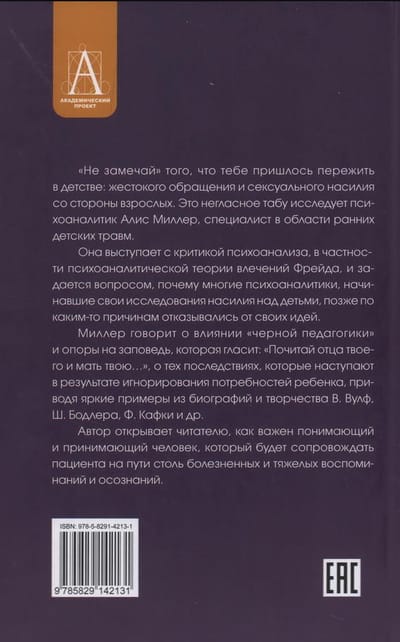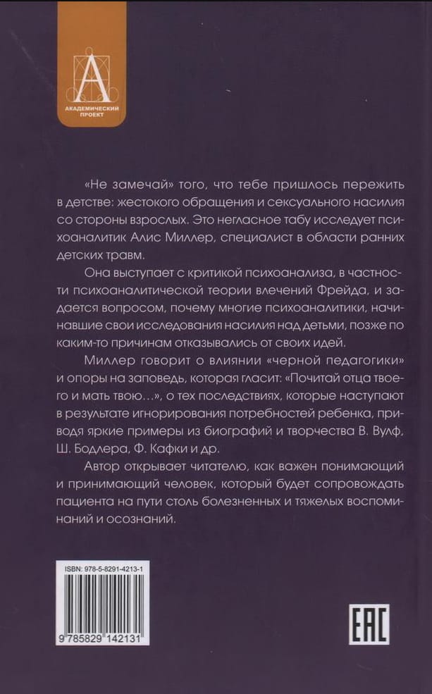 «Не замечай» того, что тебе пришлось пережить в детстве: жестокого обращения и сексуального насилия со стороны взрослых. Это негласное табу исследует психоаналитик Алис Миллер, специалист в области ранних детских травм. Она выступает с критикой психоанализа, в частности психоаналитической теории влечений Фрейда, и задается вопросом, почему многие психоаналитики, начинавшие свои исследования насилия над детьми, позже по каким-то причинам отказывались от своих идей.