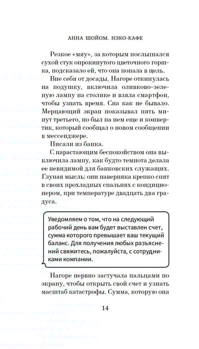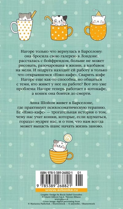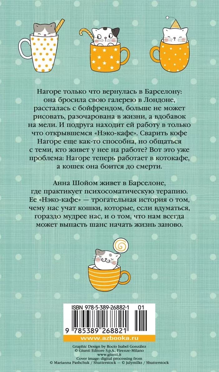 Анна Шойом, уроженка Будапешта, живет в Барселоне, где практикует психосоматическую терапию. С кошками она дружит всю жизнь и прекрасно их понимает. «Нэко-кафе» — ее первая чисто художественная книга, прозрачная и трогательная история о том, чему мы можем научиться у кошек, которые, если вдуматься, гораздо мудрее нас, и о том, что нам всегда может выпасть шанс начать жизнь заново.