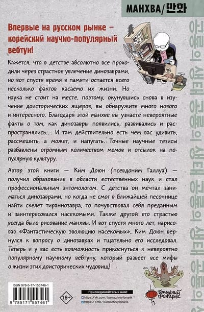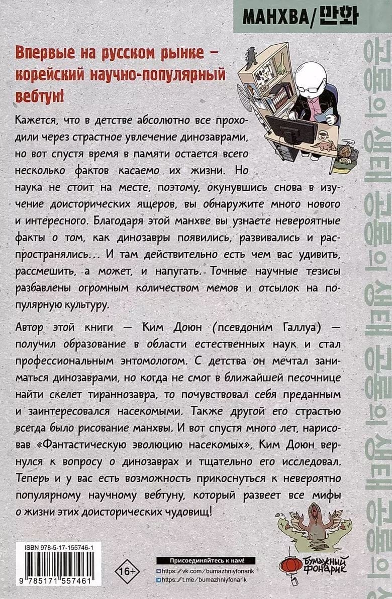 «Необычная жизнь динозавров» — это научно-популярный корейский вебтун от автора «Фантастической эволюции насекомых» Кима Доюна. Его первый комикс набрал бешеную популярность в Корее, и теперь он возвращается, чтобы рассказать читателям о динозаврах. Благодаря этой книге вы сможете узнать все о происхождении, развитии и жизни доисторических ящеров.
