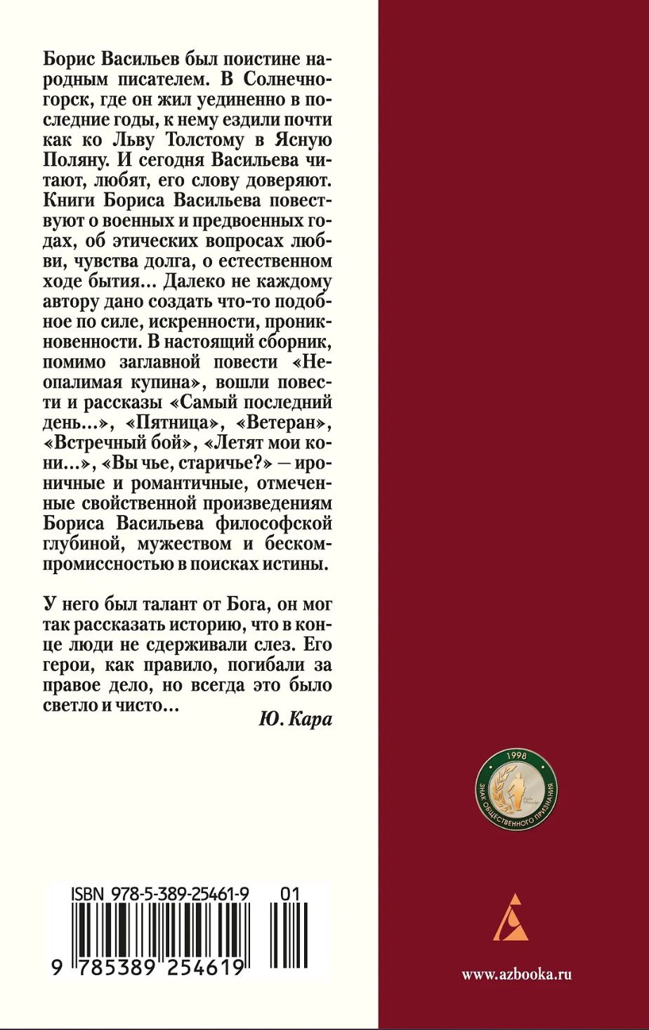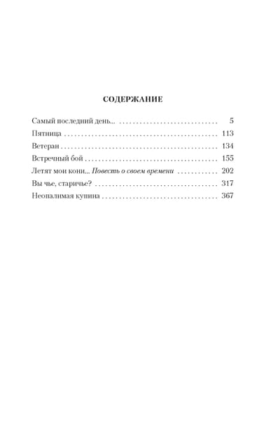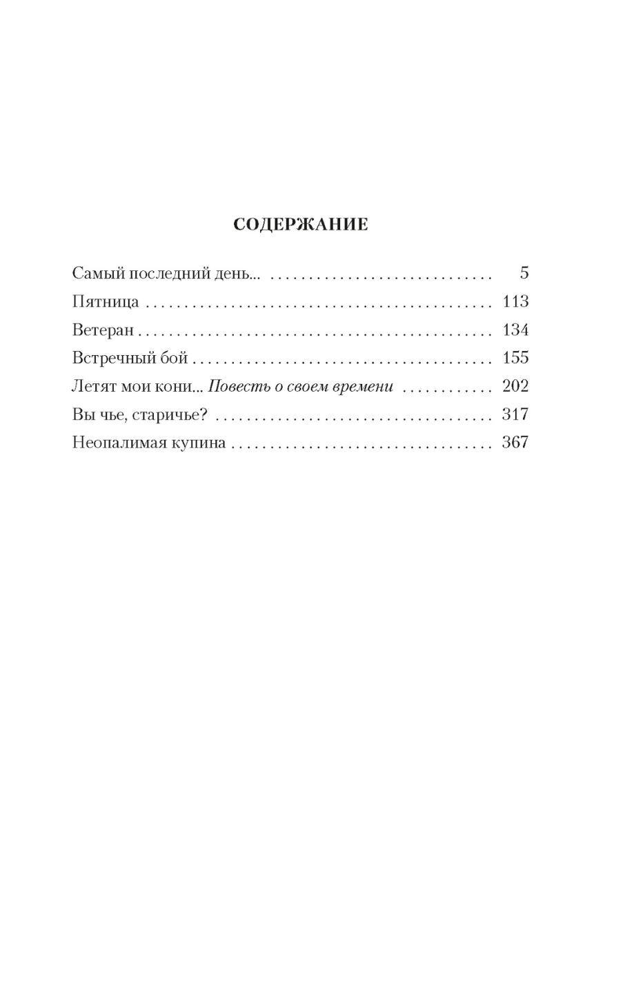 В настоящий сборник, помимо заглавной повести «Неопалимая купина», вошли повести и рассказы «Самый последний день...», «Пятница», «Ветеран», «Встречный бой», «Летят мои кони...», «Вы чье, старичье?» — ироничные и романтичные, отмеченные свойственной произведениям Бориса Васильева философской глубиной, мужеством и бескомпромиссностью в поисках истины.