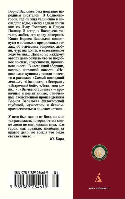 Борис Васильев был поистине народным писателем. В Солнечногорск, где он жил уединенно в последние годы, к нему ездили почти как ко Льву Толстому в Ясную Поляну. И сегодня Васильева читают, любят, его слову доверяют. Книги Бориса Васильева повествуют о военных и предвоенных годах, об этических вопросах любви, чувства долга, о естественном ходе бытия... Далеко не каждому автору дано создать что-то подобное по силе, искренности, проникновенности.