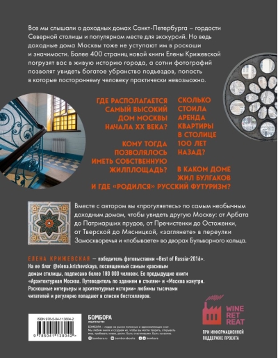 «Лучше иметь доходный дом в Москве, чем золотой рудник в Сибири». Народная мудрость. Все мы слышали о доходных домах Санкт-Петербурга — гордости «северной столицы» и популярном месте для экскурсий. Но ведь доходные дома Москвы тоже не уступают им в роскоши и значимости. Их также возводили лучшие архитекторы своего времени, богато украшая фасады и подъезды. Только слышим мы о них почему-то реже. Фотограф, блогер, краевед-любитель и писатель Елена Крижевская в своей новой книге докажет вам, что настоящая Москва — это не только Кремль, Сити и сталинские высотки, но и сотни доходных домов, расположенных в самом сердце города. Вы узнаете их истории и заглянете внутрь. Дома, где жили Булгаков и Лиля Брик, первые «небоскребы» столицы, стилизации под готику и венецианский стиль, кованые лестницы и уникальные витражи — откройте эту книгу и убедитесь, что квартира в Москве и более ста лет назад была символом богатства и предметом желания. Каждая страница в этом иллюстрированном издании — слепок живой истории России, дошедшей до наших дней.