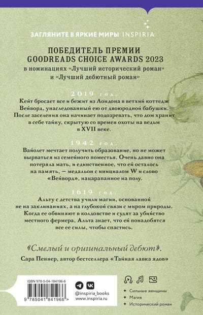 Кейт бросает все и бежит из Лондона в ветхий коттедж Вейворд, унаследованный ею от двоюродной бабушки. После заселения она начинает подозревать, что дом хранит в себе тайну, скрытую со времен охоты на ведьм в XVII веке. 1942 год. Вайолет мечтает получить образование, но не может вырваться из семейного поместья. Очень давно она потеряла мать, и единственное, что ей осталось на память — медальон с инициалом W и слово «Вейворд», нацарапанное на полу. 1619 год. Альту с детства учили магии, основанной не на заклинаниях, а на глубокой связи с миром природы. Когда ее обвиняют в колдовстве и судят за убийство местного фермера, Альта знает, что ей понадобятся все ее силы, чтобы спастись.