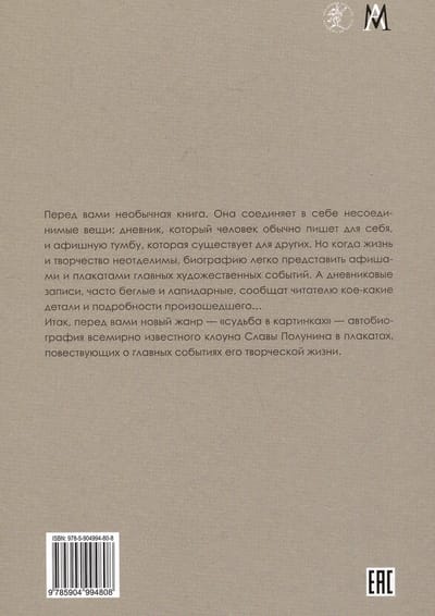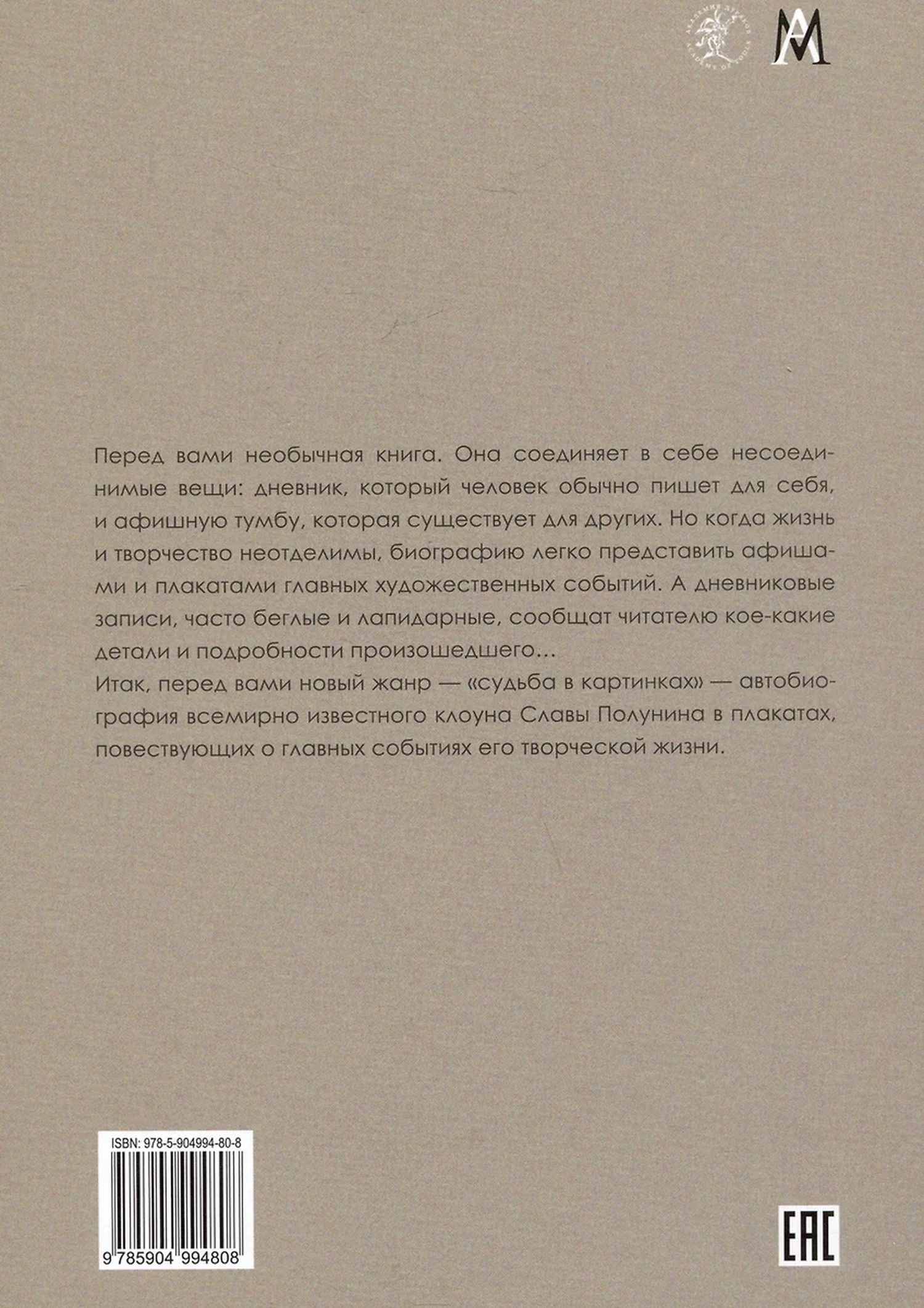 Перед вами необычная книга. Она соединяет в себе несоединимые вещи: дневник, который человек обычно пишет для себя, и афишную тумбу, которая существует для других. Но когда жизнь и творчество неотделимы, биографию легко представить афишами и плакатами главных художественных событий. А дневниковые записи, часто беглые и лапидарные, сообщат читателю кое-какие детали и подробности произошедшего… Итак, перед вами новый жанр — «судьба в картинках» — автобиография всемирно известного клоуна, Президента Международной Академии дураков Славы Полунина в плакатах, повествующих о главных событиях его творческой жизни.
