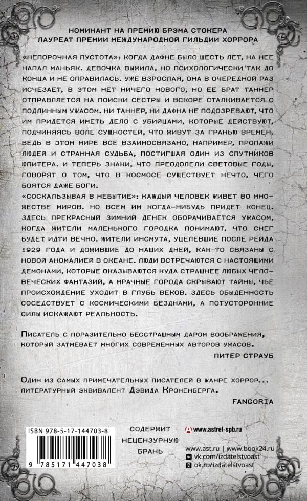 «Непорочная пустота»: Когда Дафне было шесть лет, на нее напал маньяк. Девочка выжила, но психологически так до конца и не оправилась. Уже взрослая, она в очередной раз исчезает, в этом нет ничего нового, но ее брат Таннер отправляется на поиски сестры и вскоре сталкивается с подлинным ужасом. Ни Таннер, ни Дафна не подозревают, что им придется иметь дело с убийцами, которые действуют, подчиняясь воле сущностей, что живут за гранью времен. Ведь в этом мире все взаимосвязано, например, пропажи людей и странная судьба, постигшая один из спутников Юпитера. И теперь знаки, что преодолели световые годы, говорят о том, что в космосе существует нечто, чего боятся даже боги.«Соскальзывая в небытие»: Каждый человек живет во множестве миров. Но всем им когда-нибудь придет конец. Здесь прекрасный зимний денек оборачивается ужасом, когда жители маленького городка понимают, что снег будет идти вечно. Жители Инсмута, уцелевшие после рейда 1929 года и дожившие до наших дней, как-то связаны с новой аномалией в океане. Люди встречаются с настоящими демонами, которые оказываются куда страшнее любых человеческих фантазий, а мрачные города скрывают тайны, чье происхождение уходит в глубь веков. Здесь обыденность соседствует с космическими безднами, а потусторонние силы искажают реальность.