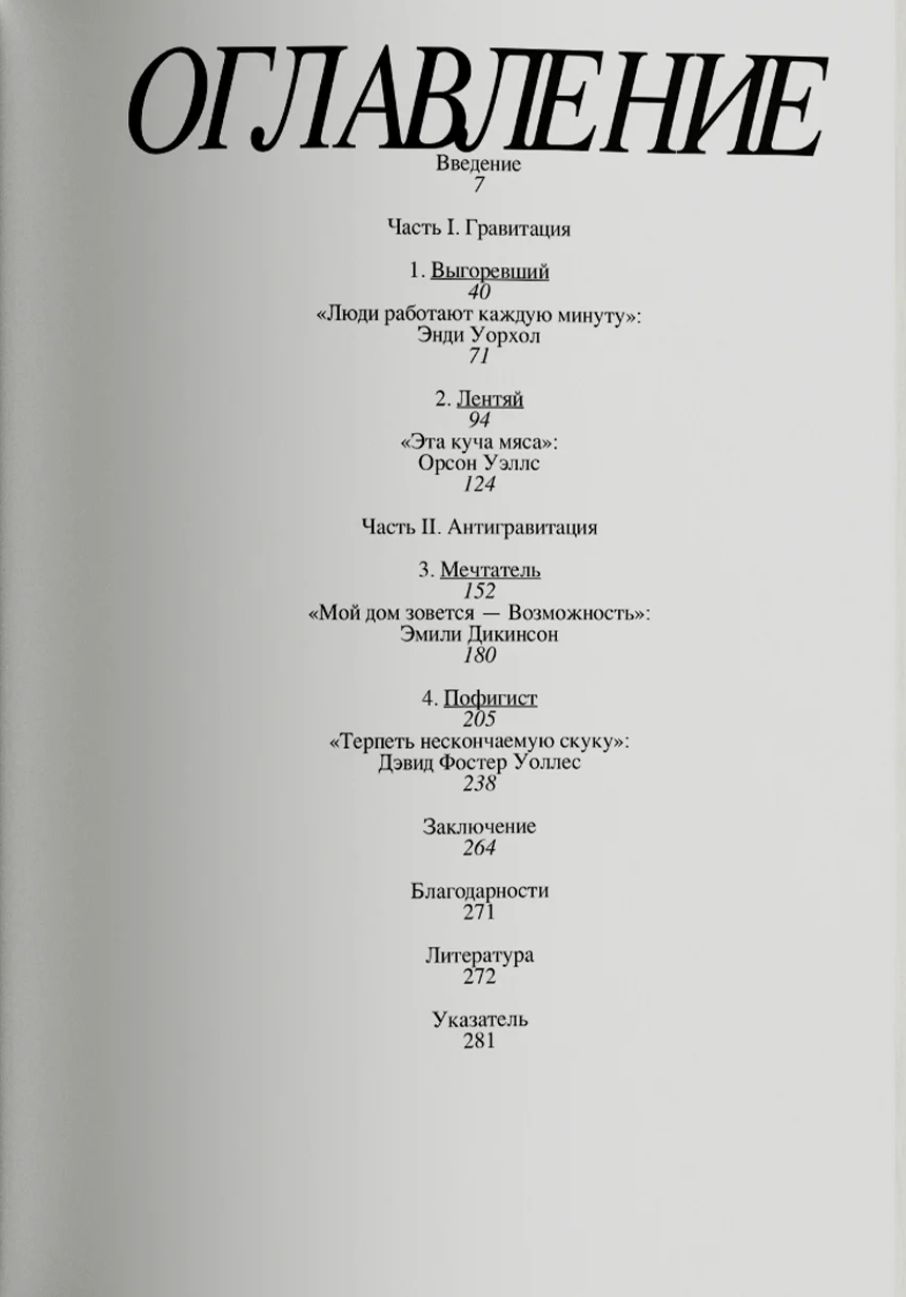 Книга британского психоаналитика Джоша Коэна посвящена нашим отношениям с трудом, точнее — заложенному в каждом из нас желанию не работать, которое отнюдь не безоблачно сосуществует с желанием работать — и добиваться успеха, престижа, благополучия, — причем, как полагает автор, является не менее, а возможно, и более важным, даже определяющим для человека. Это желание знакомо нам с детства, когда оно с легкостью удовлетворяется, но мы учимся подавлять его и привыкаем отдавать все силы работе, порой забывая, что жизнь ею не исчерпывается. Иногда результатом становятся большие достижения в избранной нами профессии, иногда — депрессия, иногда то и другое вместе. Как быть с потребностью в «неработе», которую невозможно реализовать в полной мере, но и отрицать, задавливать в себе, крайне опасно? Автор ищет подступы к ответу на этот, должно быть, неразрешимый вопрос в собственном жизненном опыте, в историях своих пациентов и в судьбах нескольких выдающихся людей, столкнувшихся с конфликтом между работой и «неработой» вплотную, — Эмили Дикинсон, Орсона Уэллса, Энди Уорхола и Дэвида Фостера Уоллеса. Из автобиографических очерков, заметок психоаналитика и тонких наблюдений о природе творчества складывается этот текст, продиктованный стремлением Джоша Коэна разобраться в себе и способный помочь в этом нам.