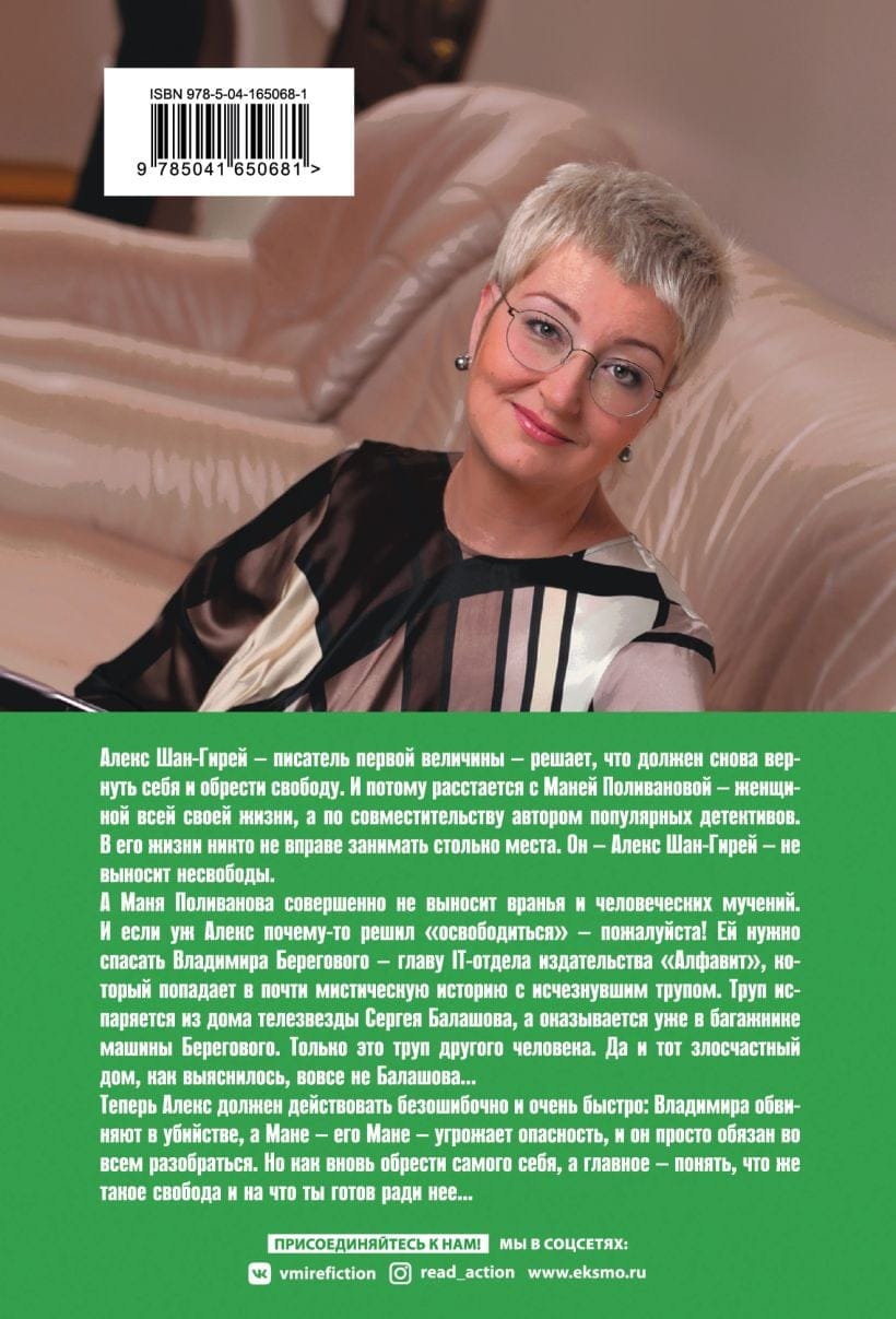 Алекс Шан-Гирей – писатель первой величины, решает, что должен снова вернуть себя и обрести свободу. И потому расстается с Маней Поливановой – женщиной всей своей жизни, а по совместительству автором популярных детективов. В его жизни никто не вправе занимать столько места. Он – Алекс Шан-Гирей – не выносит несвободы. А Маня Поливанова совершенно не выносит вранья и человеческих мучений. И если уж Алекс почему-то решил «освободиться» – пожалуйста! Ей нужно спасать Владимира Берегового – главу IT-отдела издательства «Алфавит» – который попадает в почти мистическую историю с исчезнувшим трупом. Труп испаряется из дома телезвезды Сергея Балашова, а оказывается уже в багажнике машины Берегового. Только это труп другого человека. Да и тот злосчастный дом, как выяснилось, вовсе не Балашова... Теперь Алекс должен действовать безошибочно и очень быстро: Владимира обвиняют в убийстве, а Мане – его Мане – угрожает опасность, и он просто обязан во всем разобраться. Но как вновь обрести самого себя, а главное - понять: что же такое свобода и на что ты готов ради нее…
