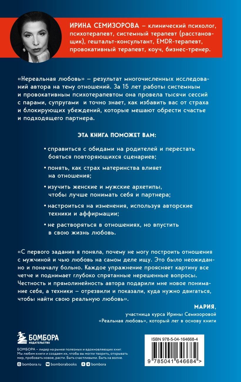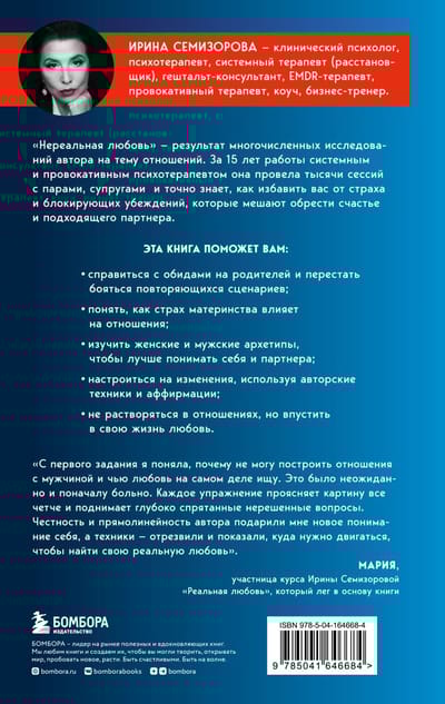«Нереальная любовь» — результат ее многочисленных исследований на тему отношений. За 15 лет работы системным и провокативным психотерапевтом она провела тысячи сессий с парами, супругами и точно знает, как избавить вас от страха и блокирующих убеждений, которые мешают обрести счастье и подходящего партнера.