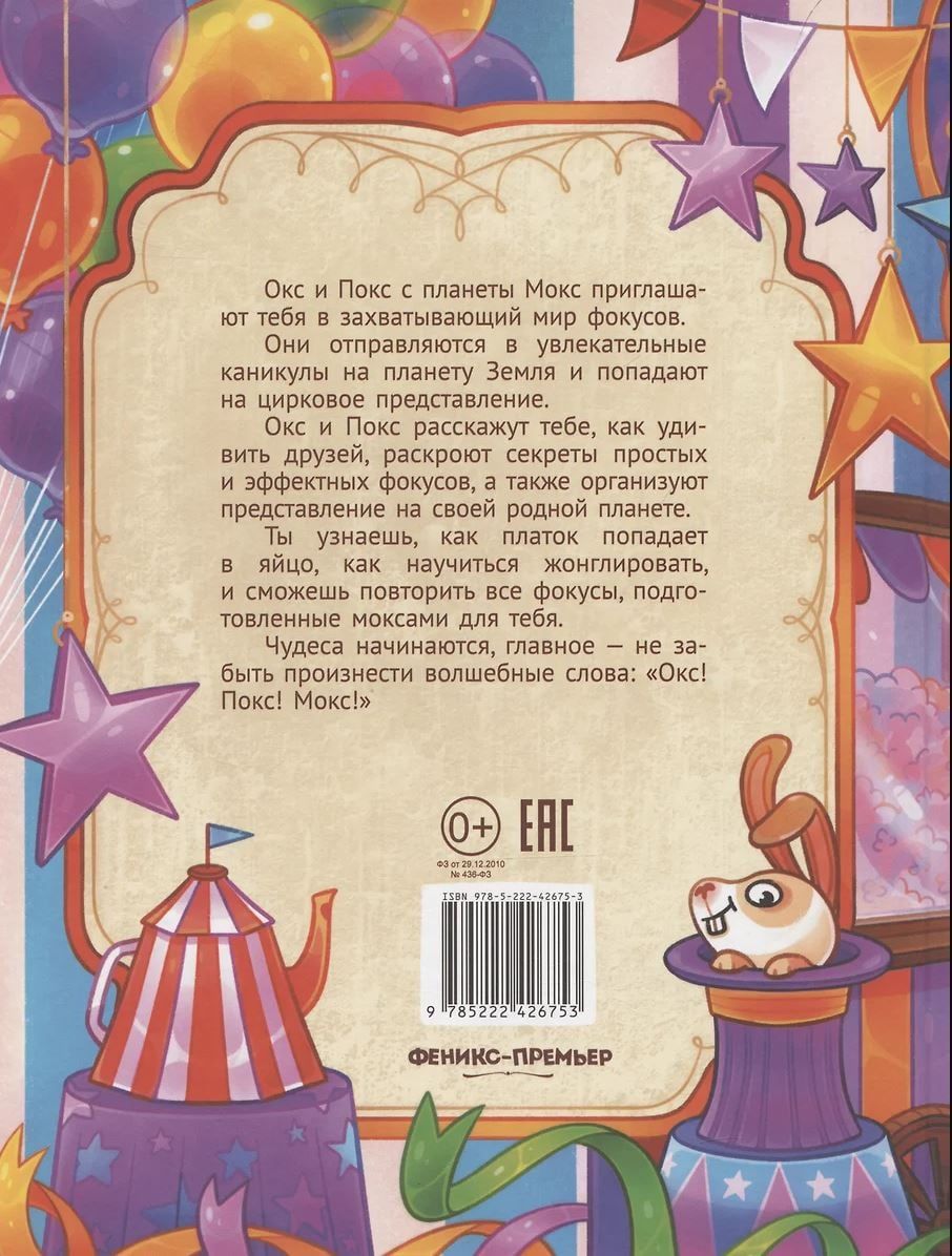 Окс и Покс приглашают тебя в увлекательное путешествие! Они живут на планете Мокс и называют себя моксами, а ещё они иногда прилетают на планету Земля на каникулы. С ними весело проводить время. С моксами ты сможешь собрать переговорное устройство из стаканчиков и шнура, заморозишь воду прямо в воздухе. Моксы придумывают устройства и проводят эксперименты, которые ты легко повторишь. Главное тут не намоксить!