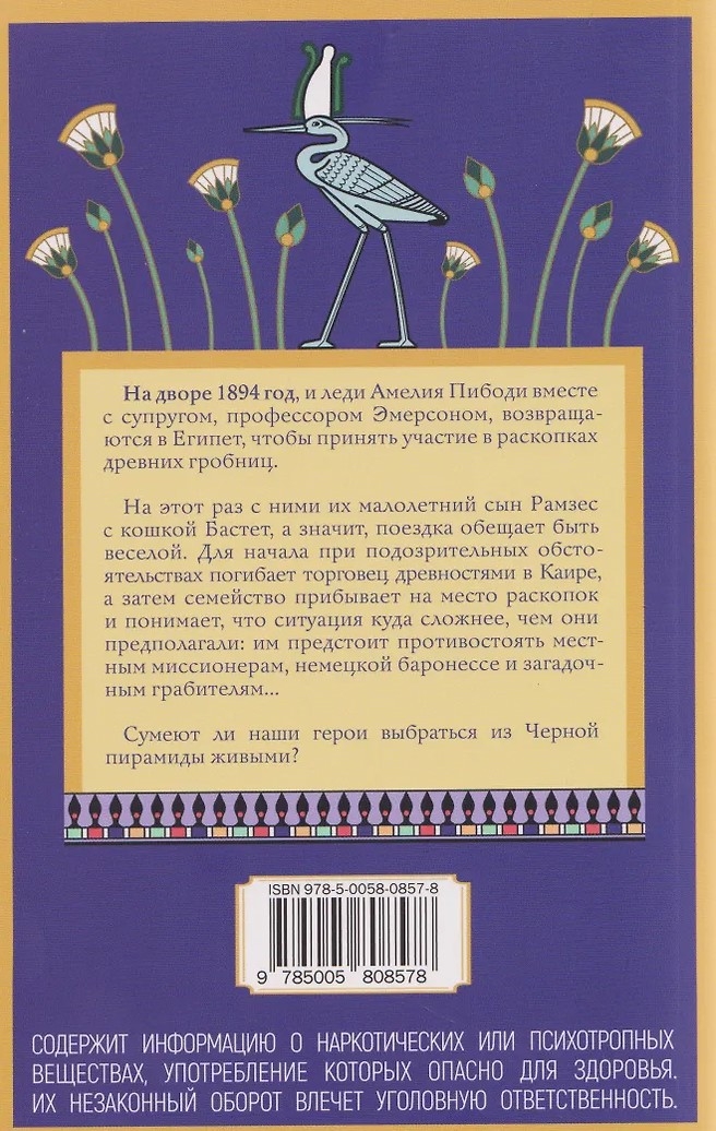 На дворе 1894 год, и леди Амелия Пибоди вместе с супругом, профессором Эмерсоном, возвращаются в Египет, чтобы принять участие в раскопках древних гробниц. На этот раз с ними их малолетний сын Рамзес с кошкой Бастет, а значит, поездка обещает быть веселой. Для начала при подозрительных обстоятельствах погибает торговец древностями в Каире, а затем семейство прибывает на место раскопок и понимает, что ситуация куда сложнее, чем они предполагали: им предстоит противостоять местным миссионерам, немецкой баронессе и загадочным грабителям… Сумеют ли наши герои выбраться из Черной пирамиды живыми?