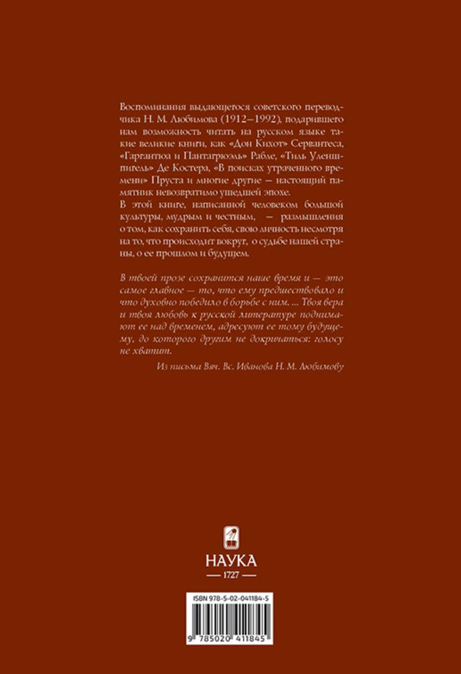 Воспоминания выдающегося советского переводчика Н.М. Любимова (1912-1992), подарившего нам возможность читать на русском языке такие великие книги, как «Дон Кихот» Сервантеса, «Гаргантюа и Пантагрюэль» Рабле, «Тиль Уленшпигель» Де Костера, «В поисках утраченного времени» Пруста и многие другие — настоящий памятник невозвратимо ушедшей эпохе. В этой книге, написанной человеком большой культуры, мудрым и честным, — размышления о том, как сохранить себя, свою личность несмотря на то, что происходит вокруг, о судьбе нашей страны, о её прошлом и будущем.