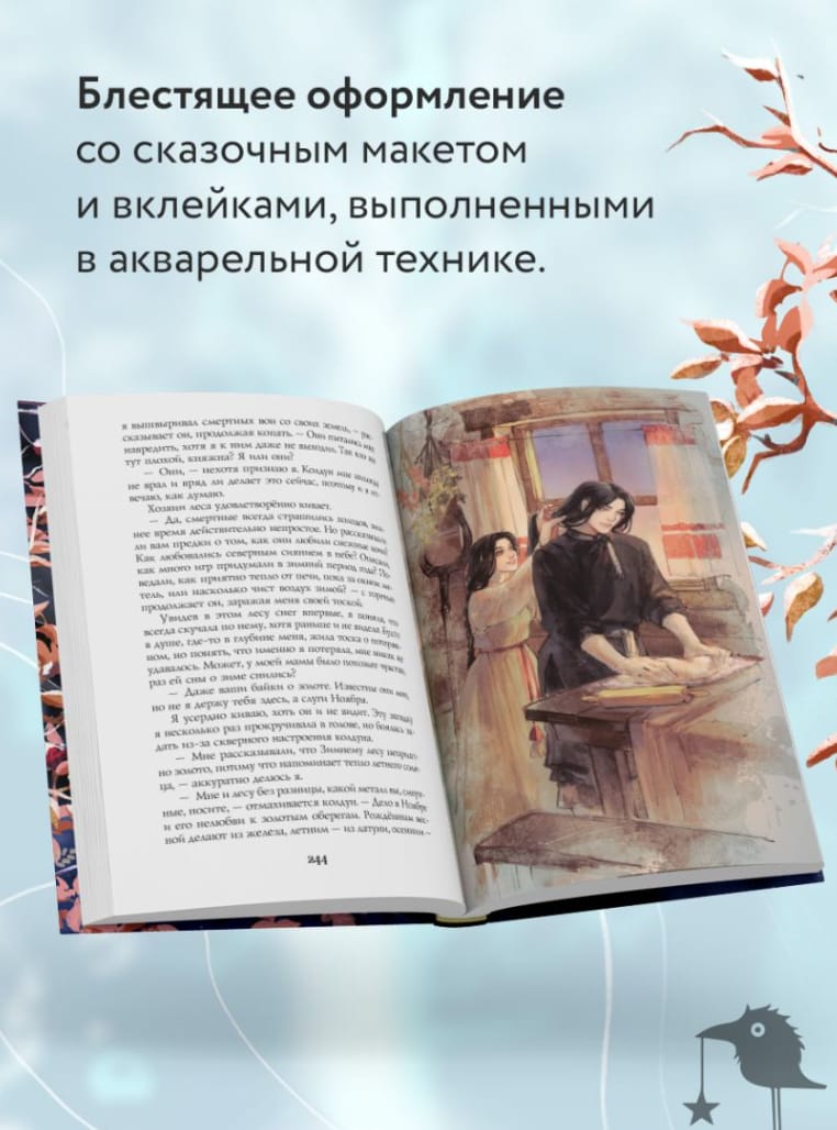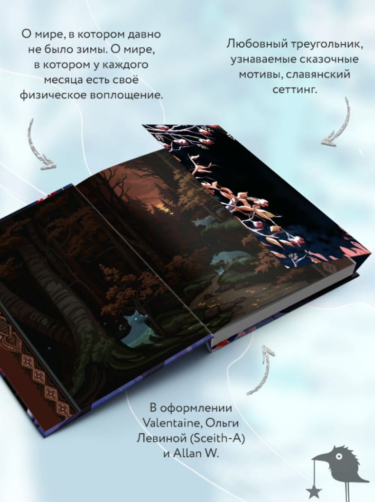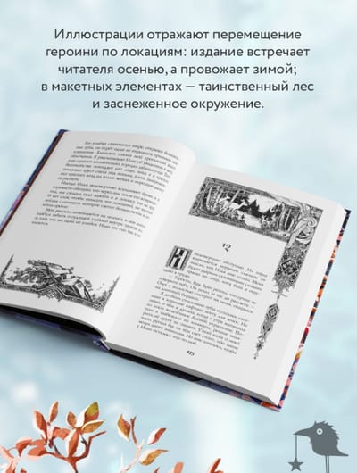 Иллюстрации отражают перемещение героини по локациям: издание встречает читателя осенью, а провожает зимой; в макетных элементах — таинственный лес и заснеженное окружение.