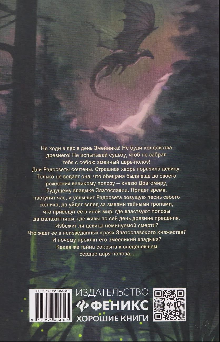Дни Радосветы сочтены. Страшная хворь поразила девицу. Только не ведает она, что обещана была еще до своего рождения великому полозу - князю Драгомиру, будущему владыке Златославии. Придет время, наступит час, и услышит Радосвета зовущую песнь своего жениха, да уйдет вслед за змеями тайными тропами, что приведут ее в иной мир, где властвуют полозы да малахитницы, где живы по сей день древние предания. Избежит ли девица неминуемой смерти? Что ждет ее в неизведанных краях Златославского княжества? И почему проклят его змееликий владыка? Какая же тайна сокрыта в оледеневшем сердце царя-полоза...