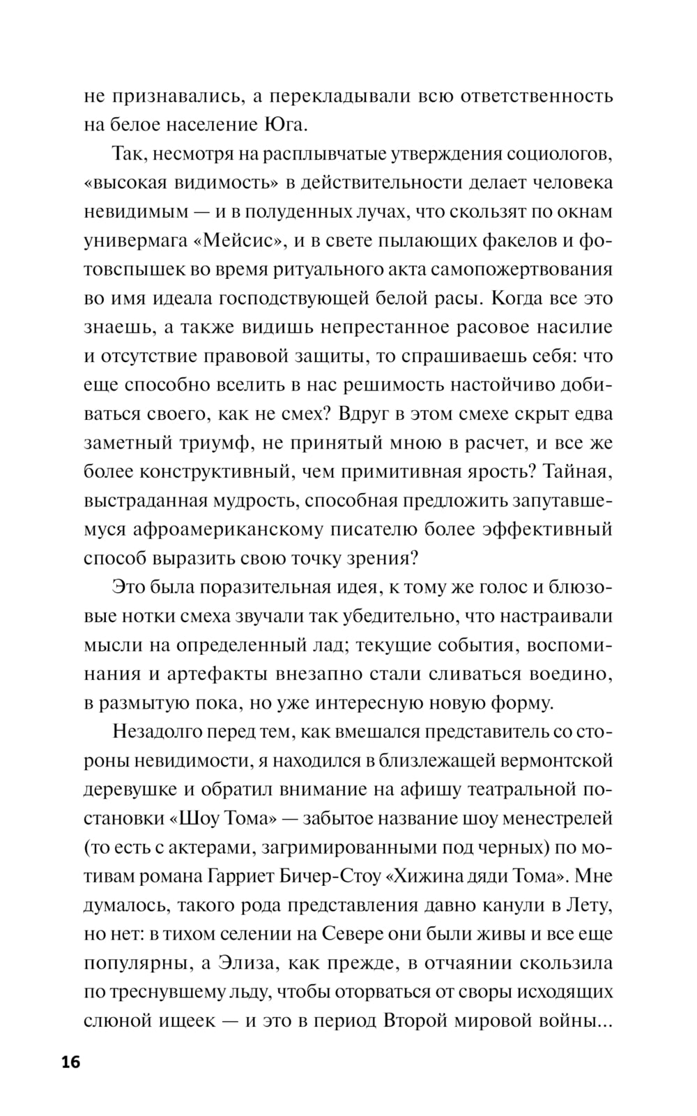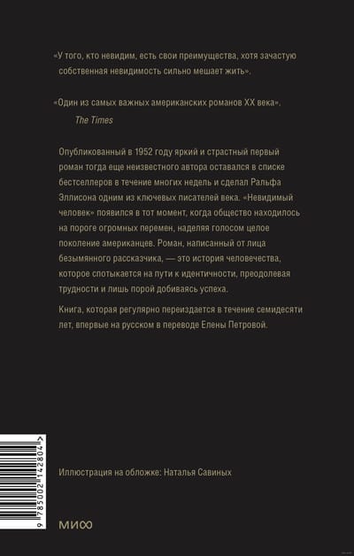 Опубликованный в 1952 году яркий и страстный первый роман тогда еще неизвестного автора оставался в списке бестселлеров в течение многих недель и сделал Ральфа Эллисона одним из ключевых писателей XX века. «‎Невидимый человек»‎ появился в тот момент, когда общество находилось на пороге огромных перемен, наделяя голосом целое поколение американцев. Роман, написанный от лица безымянного рассказчика, — это история человечества, которое спотыкается на пути к идентичности, преодолевая трудности и лишь порой добиваясь успеха.