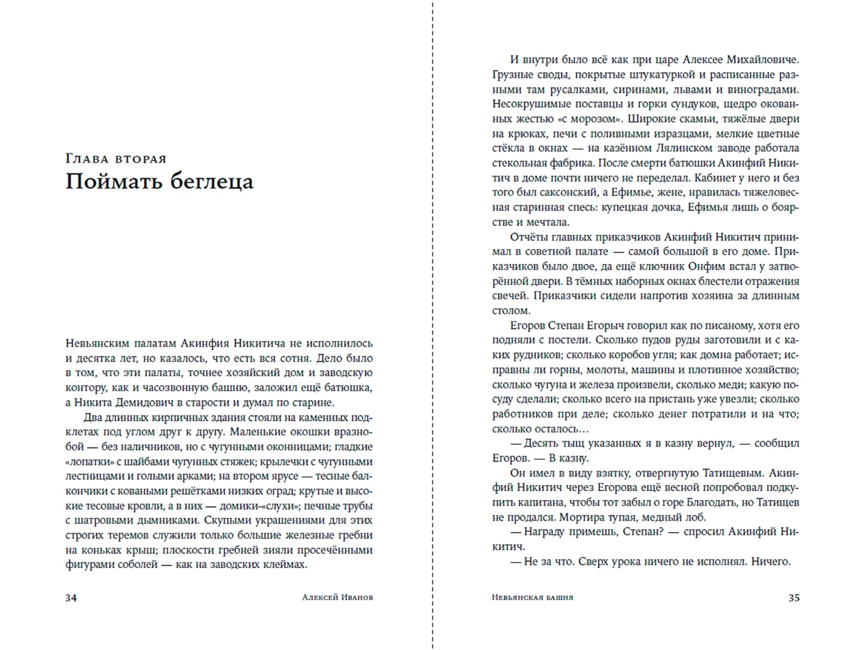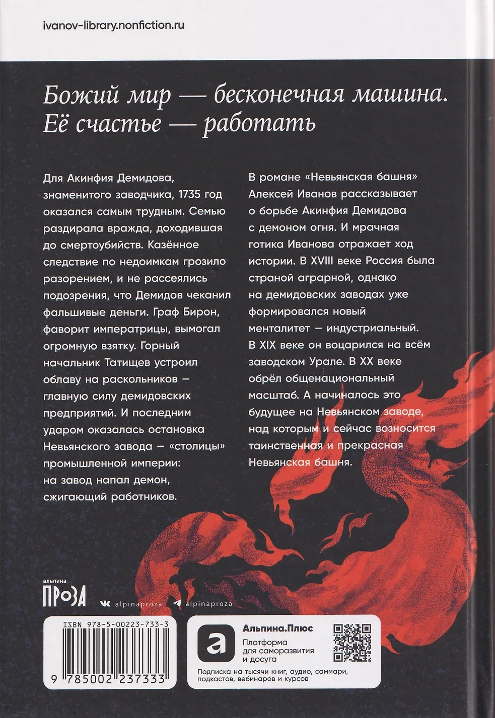 В романе «Невьянская башня» Алексей Иванов рассказывает о борьбе Акинфия Демидова с демоном огня. И мрачная готика Иванова отражает ход истории. В XVIII веке Россия была страной аграрной, однако на демидовских заводах уже формировался новый менталитет — индустриальный. В XIX веке он воцарился на всём заводском Урале. В XX веке обрёл общенациональный масштаб. А начиналось это будущее на Невьянском заводе, над которым и сейчас возносится таинственная и прекрасная Невьянская башня.