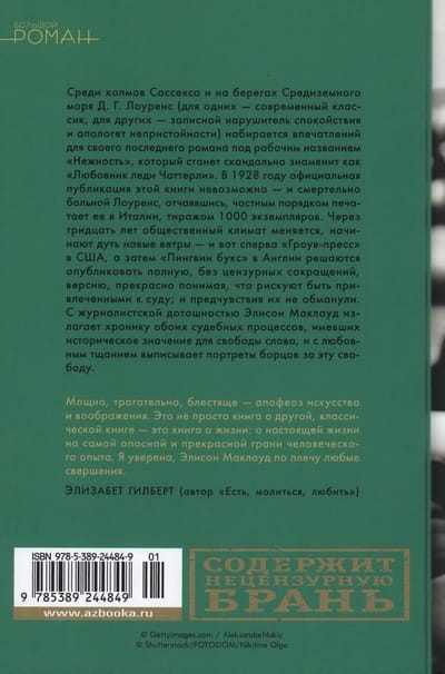 Среди холмов Сассекса и на берегах Средиземного моря Д. Г. Лоуренс (для одних — современный классик, для других — записной нарушитель спокойствия и апологет непристойности) набирается впечатлений для своего последнего романа под рабочим названием «Нежность», который станет скандально знаменит как «Любовник леди Чаттерли». В 1928 году официальная публикация этой книги невозможна — и смертельно больной Лоуренс, отчаявшись, частным порядком печатает ее в Италии, тиражом 1000 экземпляров. Через тридцать лет общественный климат меняется, начинают дуть новые ветры — и вот сперва «Гроув-пресс» в США, а затем «Пингвин букс» в Англии решаются опубликовать полную, без цензурных сокращений, версию, прекрасно понимая, что рискуют быть привлеченными к суду; и предчувствия их не обманули. С журналистской дотошностью Элисон Маклауд излагает хронику обоих судебных процессов, имевших историческое значение для свободы слова, и с любовным тщанием выписывает портреты борцов за эту свободу. Впервые на русском — «гимн свободе и творческому воображению» (Мадлен Миллер) от автора, которому «по плечу любые свершения» (Элизабет Гилберт).