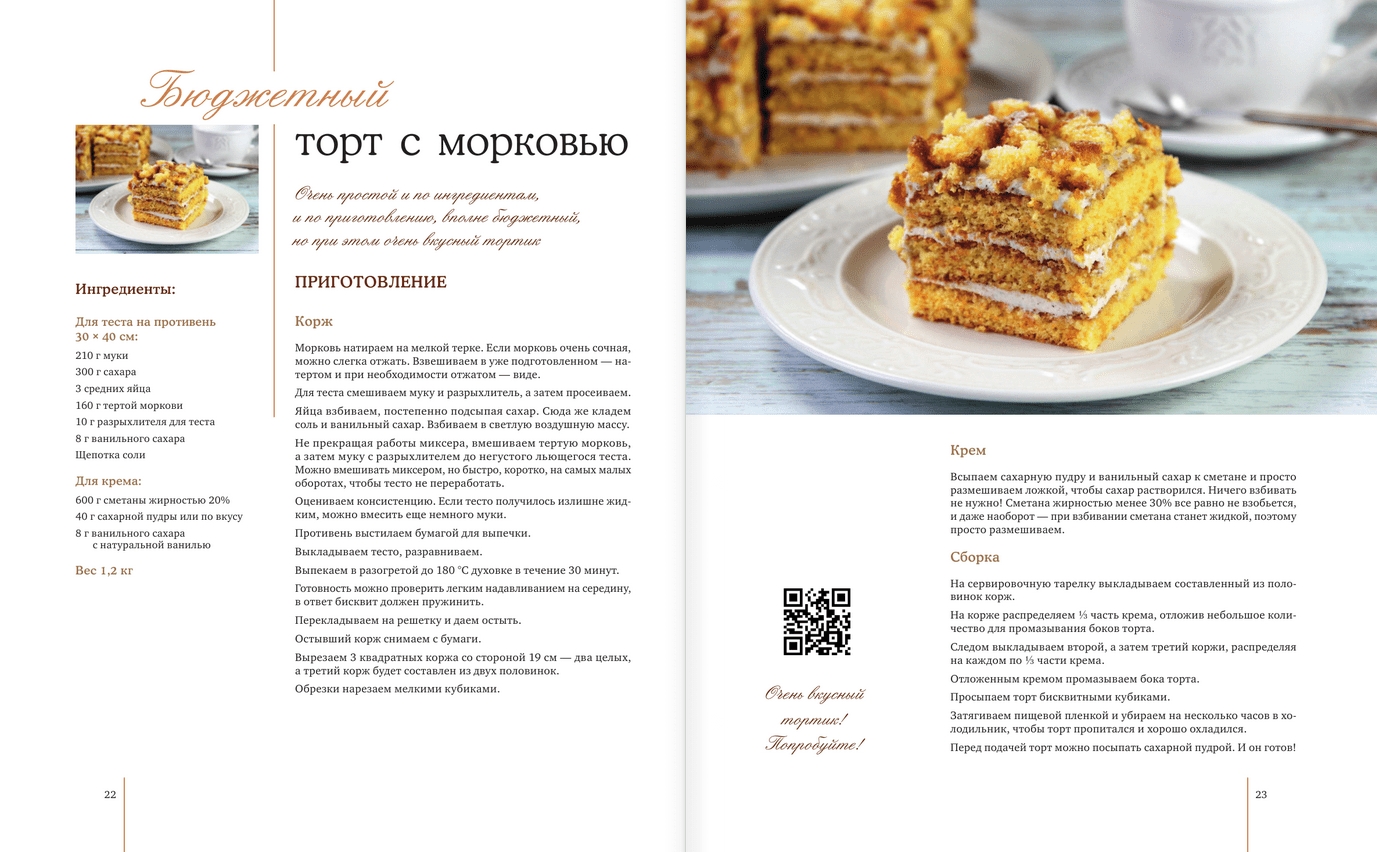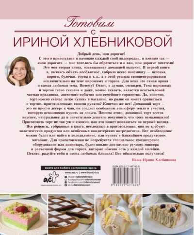 Добрый день, мои дорогие! С этого приветствия я начинаю каждый свой видеоролик, и именно так — «мои дорогие» — мне хотелось бы обратиться и к вам, мои дорогие читатели! Это моя вторая книга, посвященная домашней выпечке. В первой книге я, пытаясь объять необъятное, собрала всего понемногу — печенья, пироги, булочки, торты и т. д., а в этой решила сконцентрироваться исключительно на теме пирожных и тортов. Для меня это самая яркая и самая любимая тема. Почему? Ответ, я думаю, очевиден. Тема пирожных и тортов тесно связана и даже, можно сказать, является неотъемлемой часть праздника, значимого события или семейного торжества. Да, конечно, торт можно сейчас легко купить в магазине, но разве он может сравниться с тортом, приготовленным своими руками? Конечно же нет! Домашний торт — это не просто десерт к чаю, он создает особенную атмосферу тепла и участия, которую невозможно купить за деньги. Помимо этого, домашний торт всегда вкуснее, натуральнее да и значительно дешевле покупного, что тоже немаловажно! Приготовить торт не так уж и сложно, как это может показаться на первый взгляд. Все рецепты, собранные в книге, несложные в приготовлении, они не требуют экзотических продуктов или особенных кондитерских ингредиентов. Все необходимое можно будет или найти в холодильнике, или купить в ближайшем продуктовом магазине. Для приготовления не потребуется специальное кондитерское оборудование или инвентарь, будет вполне достаточно ручного миксера и разъемной формы для тортов, которые обычно есть у каждой хозяйки. Пеките, радуйте себя и своих любимых близких! Все обязательно получится! Ваша Ирина Хлебникова